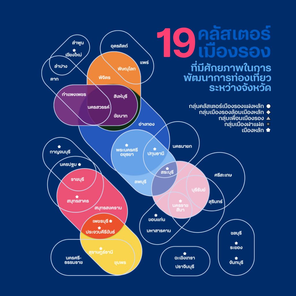 แต่เขตการพัฒนาการท่องเที่ยวสามารถพัฒนาให้มีประสิทธิภาพขึ้นได้ หากมีข้อมูล mobility data ช่วยเสริมการวางแผนพัฒนา เพื่อให้สอดรับกับพฤติกรรมการเดินทางของนักท่องเที่ยว ทีมวิจัยจากจุฬาลงกรณ์มหาวิทยาลัยจึงได้ทำการวิเคราะห์การจับกลุ่มคลัสเตอร์ของจังหวัดเมืองรองกับจังหวัดโดยรอบผ่านการวิเคราะห์ข้อมูลการเดินทางท่องเที่ยวระหว่างจังหวัด พบว่าการจับกลุ่มคลัสเตอร์ที่มีเมืองรองเป็นสมาชิกสามารถแบ่งออกเป็น 4 รูปแบบ ประกอบด้วย19 กลุ่มจังหวัด ได้แก่