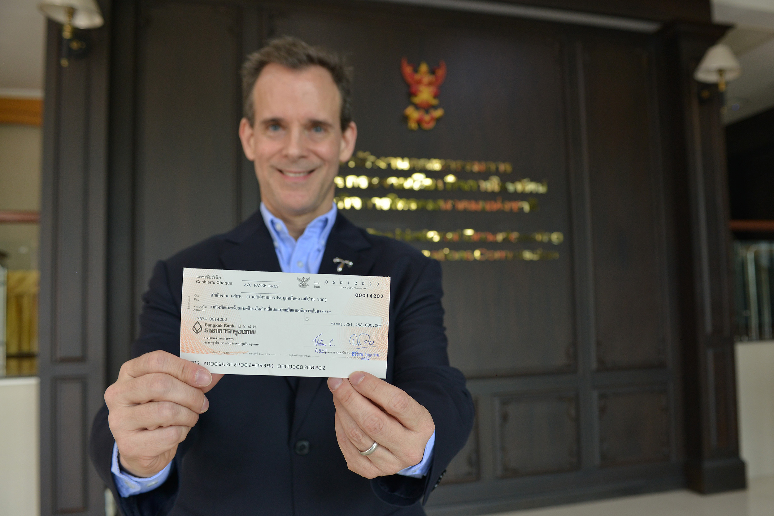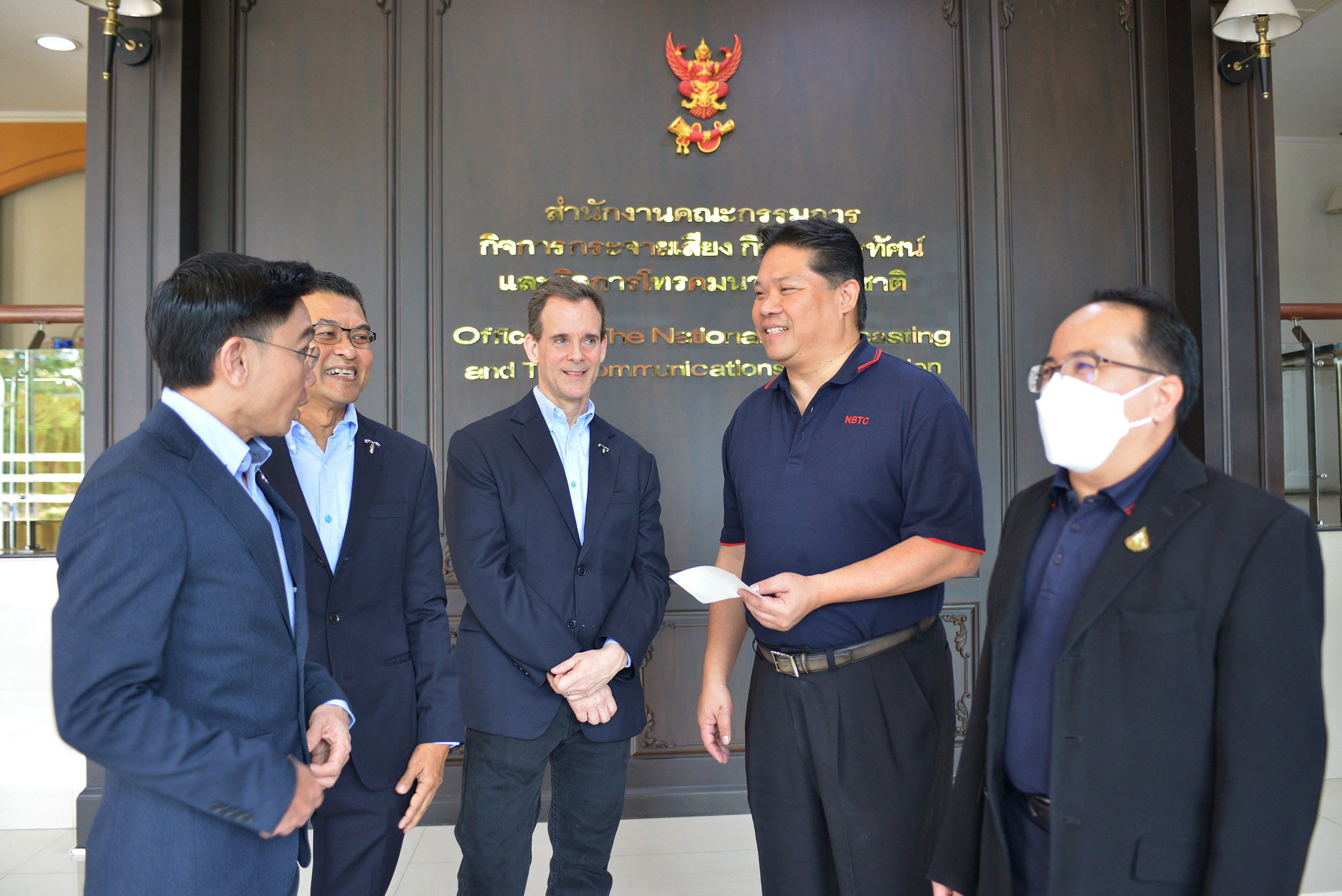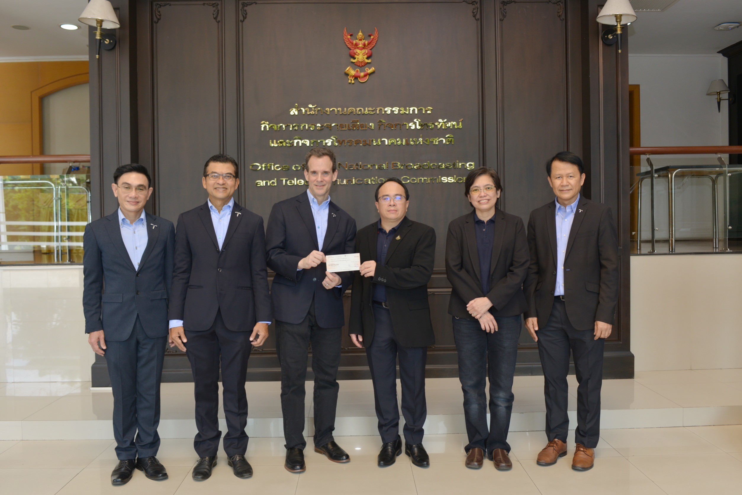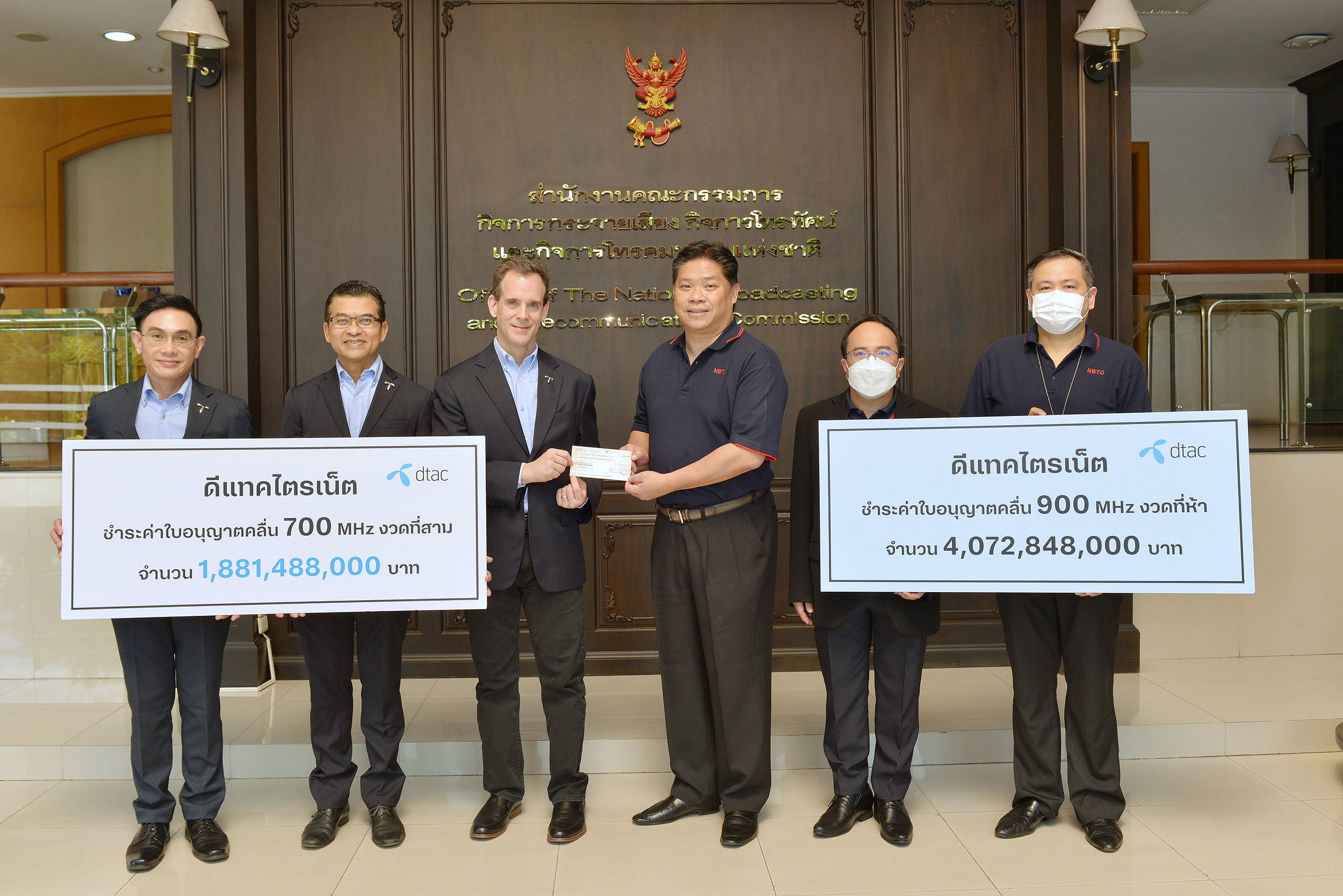 นายสตีเฟ่น เจมส์ แฮลวิก (ที่ 3 จากซ้าย) รักษาการรองประธานเจ้าหน้าที่บริหาร กลุ่มกิจการองค์กร บริษัท โทเทิ่ล แอ็คเซ็ส คอมมูนิเคชั่น จำกัด (มหาชน) หรือดีแทค พร้อมด้วย นายนฤพนธ์ รัตนสมาหาร (ที่ 2 จากซ้าย) ผู้อำนวยการอาวุโส สายงานรัฐกิจสัมพันธ์ และนายเลิศรัตน์ รตะนานุกูล (ซ้ายสุด) ผู้อำนวยการอาวุโส ฝ่ายประสานงานภาครัฐ ชำระค่าคลื่นความถี่ 700 MHz งวดที่ 3 และค่าคลื่นความถี่ 900 MHz งวดที่ 5 โดยมีนายไตรรัตน์ วิริยะศิริกุล (ที่ 4 จากซ้าย) รักษาการแทน เลขาธิการ กสทช. เป็นผู้รับมอบ พร้อมด้วยนายสุทธิศักดิ์ ตันตะโยธิน (ที่ 5 จากซ้าย) รองเลขาธิการ กสทช. และนายเนติพงษ์ ตลับนาค(ขวาสุด) ผู้อำนวยการสำนัก สำนักการอนุญาตประกอบกิจการโทรคมนาคม 1 กสทช. เมื่อวันที่ 6 มกราคม 2566