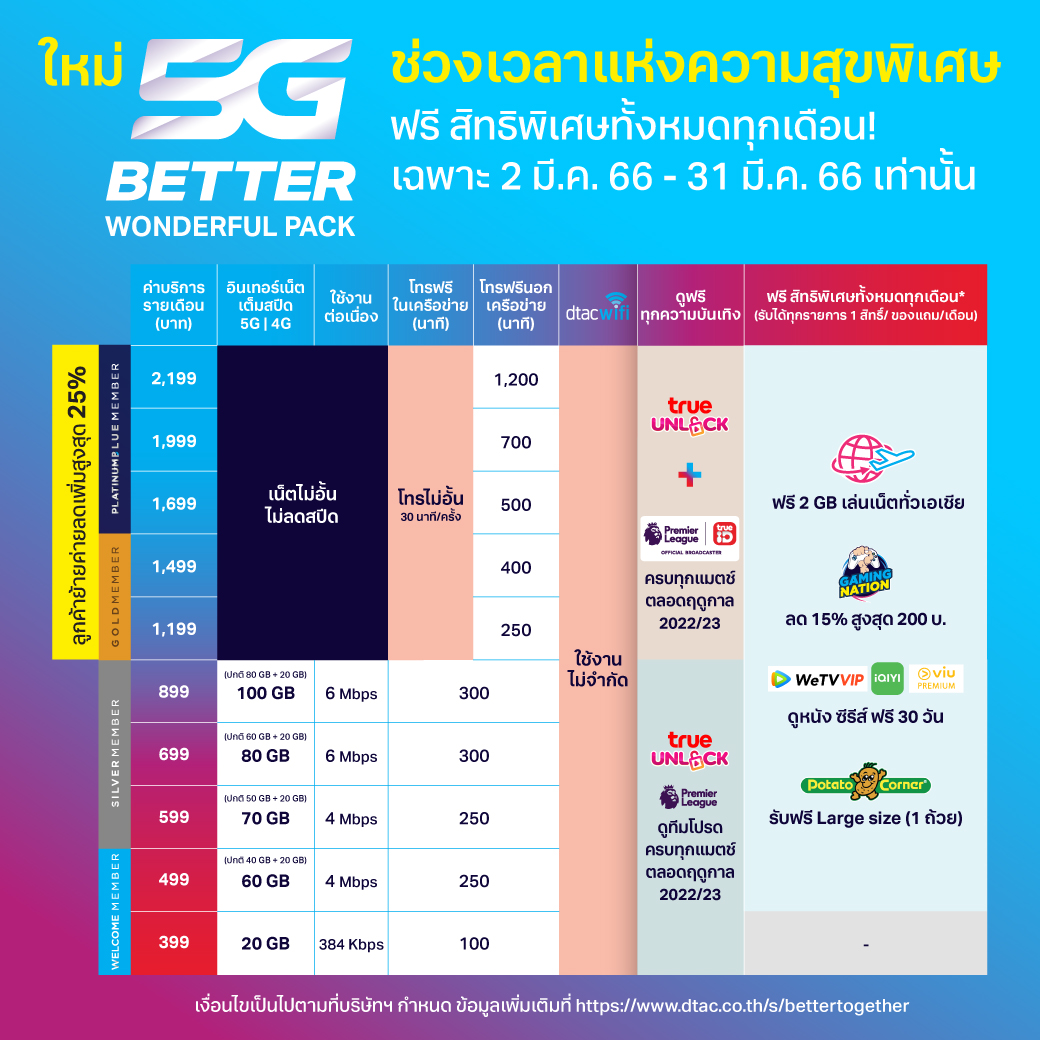 - ดีแทคแนะนำ แพ็กเกจใหม่ dtac 5G Better Wonderful Pack ผนึกกำลังทรู จัดเต็มแพ็กเกจดีสุด คุ้มสุด ให้มากกว่า พิเศษเฉพาะลูกค้าใหม่ทั้งแบบเติมเงินและรายเดือน สมัครได้ตั้งแต่วันนี้ ถึง 31 มี.ค นี้ เท่านั้น