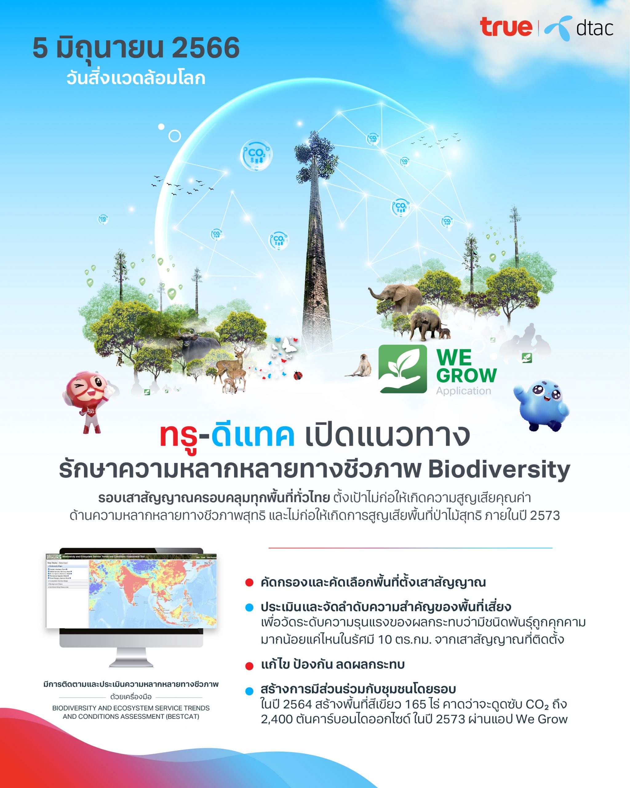 หนึ่งในภารกิจหลักหลังการควบรวมทรู-ดีแทค คือ การส่งมอบเครือข่ายสัญญาณที่ดียิ่งกว่า ครอบคลุมยิ่งขึ้นทั่วไทย โดยที่ผ่านมา การติดตั้งเสาสัญญาณ นอกเหนือจากจะต้องเป็นไปตามกฎระเบียบที่กสทช.กำหนดไว้แล้ว ทุกพื้นที่ที่ทรูและดีแทคติดตั้งเสาสัญญาณจะมีการนำปัจจัยเรื่อง ความหลากหลายทางชีวภาพ หรือ Biodiversity มาใช้ในการวางแผน โดยทีมปฏิบัติการจะทำการสำรวจสิ่งมีชีวิตนานาพันธุ์ในระบบนิเวศรอบพื้นที่เสาสัญญาณ ควบคู่กับการปลูกต้นไม้เพื่อให้เป็นแหล่งที่อยู่อาศัยสมบูรณ์ของสัตว์และพันธุ์พืช เพื่อบรรลุเป้าหมายที่จะไม่ก่อให้เกิดความสูญเสียคุณค่าด้านความหลากหลายทางชีวภาพสุทธิ และไม่ก่อให้เกิดการสูญเสียพื้นที่ป่าไม้สุทธิ ภายในปี 2573 สอดคล้องกับเป้าหมายการพัฒนาอย่างยั่งยืนขององค์การสหประชาชาติ หรือ SDGs “เป้าหมายที่ 15 ปกป้อง ฟื้นฟู และส่งเสริมการใช้ระบบนิเวศบนบกอย่างยั่งยืน” โดยมีกระบวนการที่ชัดเจน