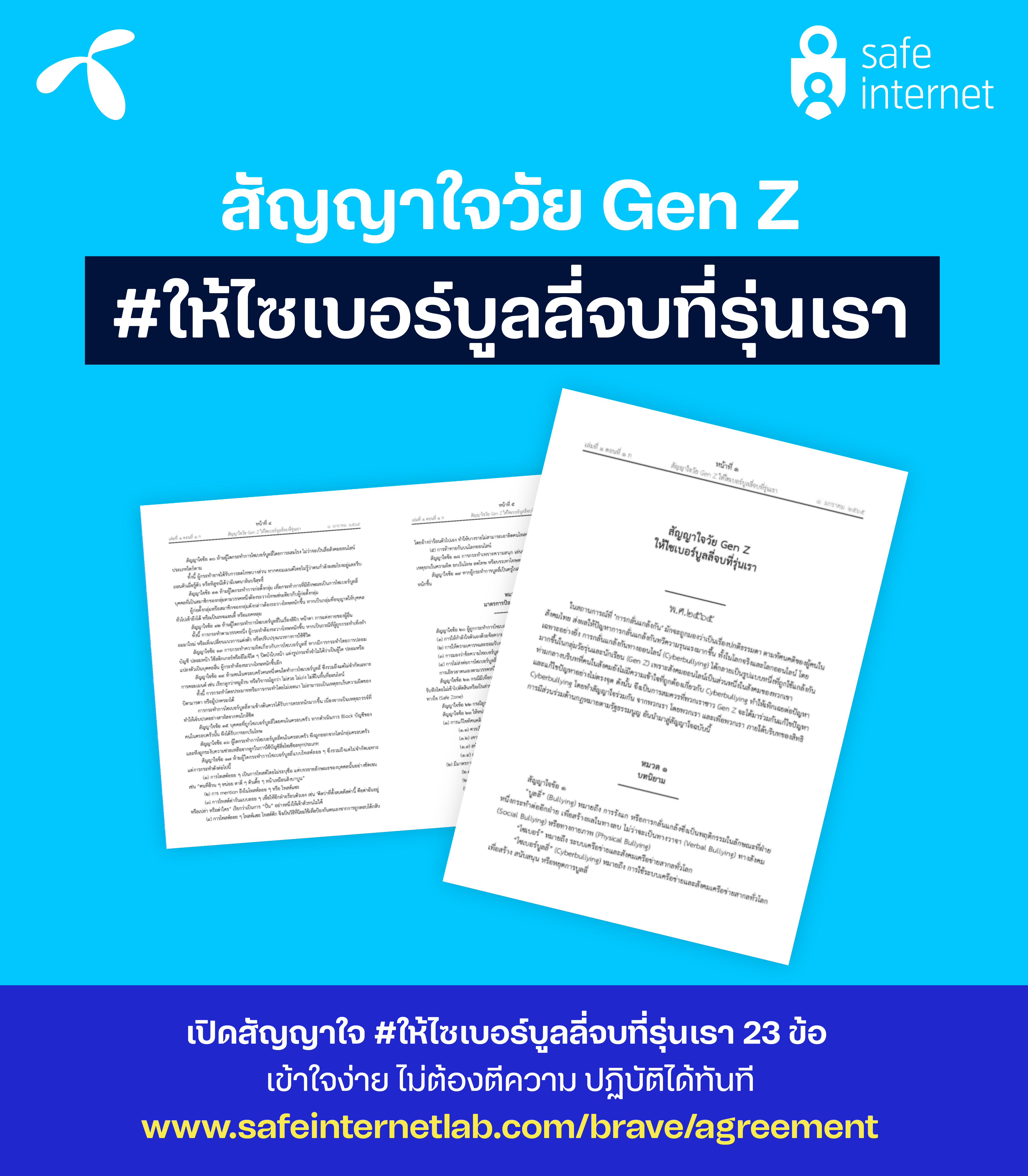 สำหรับผู้ที่สนใจ “ฟัง” เสียงของคนรุ่นใหม่ฉบับเต็ม สามารถอ่านความคิดพวกเขาได้ที่ https://www.safeinternetlab.com/brave/agreement เข้าใจง่าย นำไปปฏิบัติได้ทันที ไม่ต้องตีความ ร่วมส่งเสียงต่อได้ เพื่อสร้างสังคมออนไลน์แบบที่รุ่นเราอยากเห็น