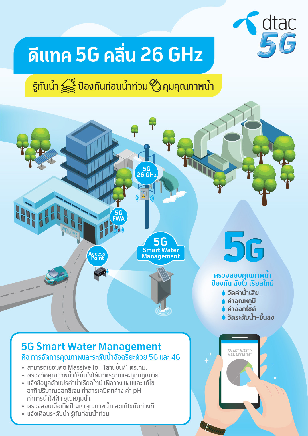 เพื่อให้การบริหารจัดการน้ำมีคุณภาพมากยิ่งขึ้น จึงเกิดความร่วมมือระหว่าง ดับบลิวเอชเอ กรุ๊ป และ ดีแทค ในการนำเทคโนโลยี 5G เข้ามายกระดับเทคโนโลยีบริหารจัดการน้ำ ซึ่งจะได้ประโยชน์จากการส่งข้อมูลแบบเรียลไทม์ จากเซ็นเซอร์ที่มีความแม่นยำ นำไปสู่การวิเคราะห์และบริหารจัดการน้ำได้ดียิ่งขึ้น ด้วยการนำ 5G มาใช้ในระบบบริหารจัดการน้ำอัจฉริยะ (Smart Water Management) ร่วมกับอุปกรณ์อย่าง Massive Machine Type Communications (mMTC) หรือ Massive IoT ช่วยในการมอนิเตอร์คุณภาพน้ำให้เหมาะสมกับรูปแบบการใช้งานในแต่ละอุตสาหกรรม ช่วยลดความผิดพลาดในการดูแลคุณภาพน้ำ โดยเฉพาะค่าความเป็นกรดและด่าง (pH) ร่วมกับการนำเซ็นเซอร์ที่ช่วยวัดค่าออกไซด์ในน้ำ วัดระดับการขึ้น-ลงของน้ำ มาส่งข้อมูลผ่านโครงข่าย 5G ที่มีความเสถียร และทำงานได้อย่างมีประสิทธิภาพ