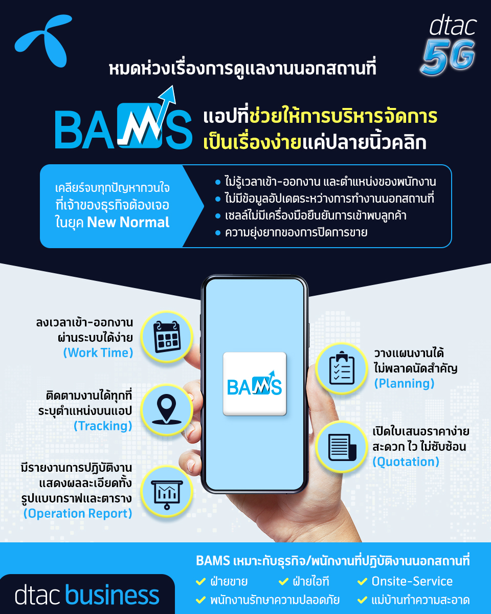 - dtac business แนะนำ โซลูชัน BAMS ระบบบริหารจัดการ Work from Home ที่ทำให้ธุรกิจทำงานที่บ้านได้ง่ายขึ้น ชูจุดแข็งด้านบริหารวันเวลาทำงานของพนักงาน สร้างงานขาย งานบริการที่ครบถ้วนและตอบโจทย์ธุรกิจมากที่สุดในตลาด
