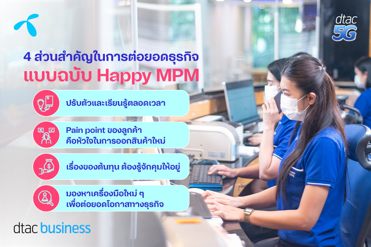 Happy MPM ได้ก้าวผ่านคำสบประมาทเกี่ยวกับภาพจำเก่า ๆ ของธุรกิจเครือข่ายไปได้ ด้วยแนวคิดและมุมมองที่เปลี่ยนทันยุคสมัยเสมอ และมีลูกค้าเป็นหัวใจสำคัญของธุรกิจ พร้อมไม่หยุดที่จะมองหาโซลูชันใหม่ ๆ ที่จะช่วยเพิ่มโอกาสในการเติบโต โดยเชื่อใจให้ dtac business เป็นเพื่อนคู่คิดช่วยขับเคลื่อนธุรกิจไปข้างหน้าด้วยดิจิทัลโซลูชันอย่างมีประสิทธิภาพครับ