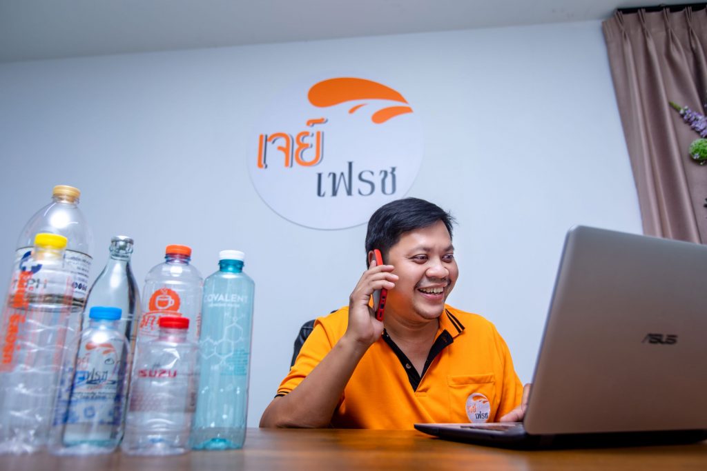 “ช่วงนั้นร้านอาหาร โรงแรม โรงเรียน เกือบทุกที่ที่มีสินค้าของเราปิดหมดเลย แต่เราวิเคราะห์ว่า ช่วงล็อกดาวน์คนอยู่บ้านยังต้องบริโภคน้ำเท่าเดิม ดังนั้นจะทำอย่างไรให้ผลิตภัณฑ์ของเราไปถึงลูกค้าได้โดยตรง เลยให้รถแบ่งสายวิ่งขายน้ำทั่วจังหวัดจนยอดกระเตื้องขึ้น จนตอนนี้ยอดโตขึ้นถึงกว่า 700,000 บาทต่อเดือน เยอะกว่าก่อนมีโควิดอีก พอต้องล็อคดาวน์อีกรอบก็ไม่เจอปัญหาเดิมแล้ว เพราะเราแก้ปัญหานั้นเรียบร้อย คุณภาพการผลิตก็เป็นอีกสิ่งที่เจย์ เฟรช ให้ความสำคัญเสมอมา แต่เดิมในขั้นตอนผลิต พนักงานต้องใส่หน้ากากอนามัย เปลี่ยนเสื้อผ้า และสวมตาข่ายคลุมผมอยู่แล้ว จึงไม่ถือเป็นนิวนอร์มัลของบริษัท เมื่อโควิดมาเยือน บริษัทก็ยังคงยึดถือแนวปฏิบัติเช่นเดิม แต่เพิ่มการตรวจวัดอุณหภูมิก่อนเข้างาน จัดวางแอลกอฮอล์สำหรับล้างมือ และตรวจ ATK พนักงานทุก 2 สัปดาห์ สร้างความมั่นใจด้านสุขอนามัยและเพื่อรักษาคุณภาพการผลิตให้คงเส้นคงวา