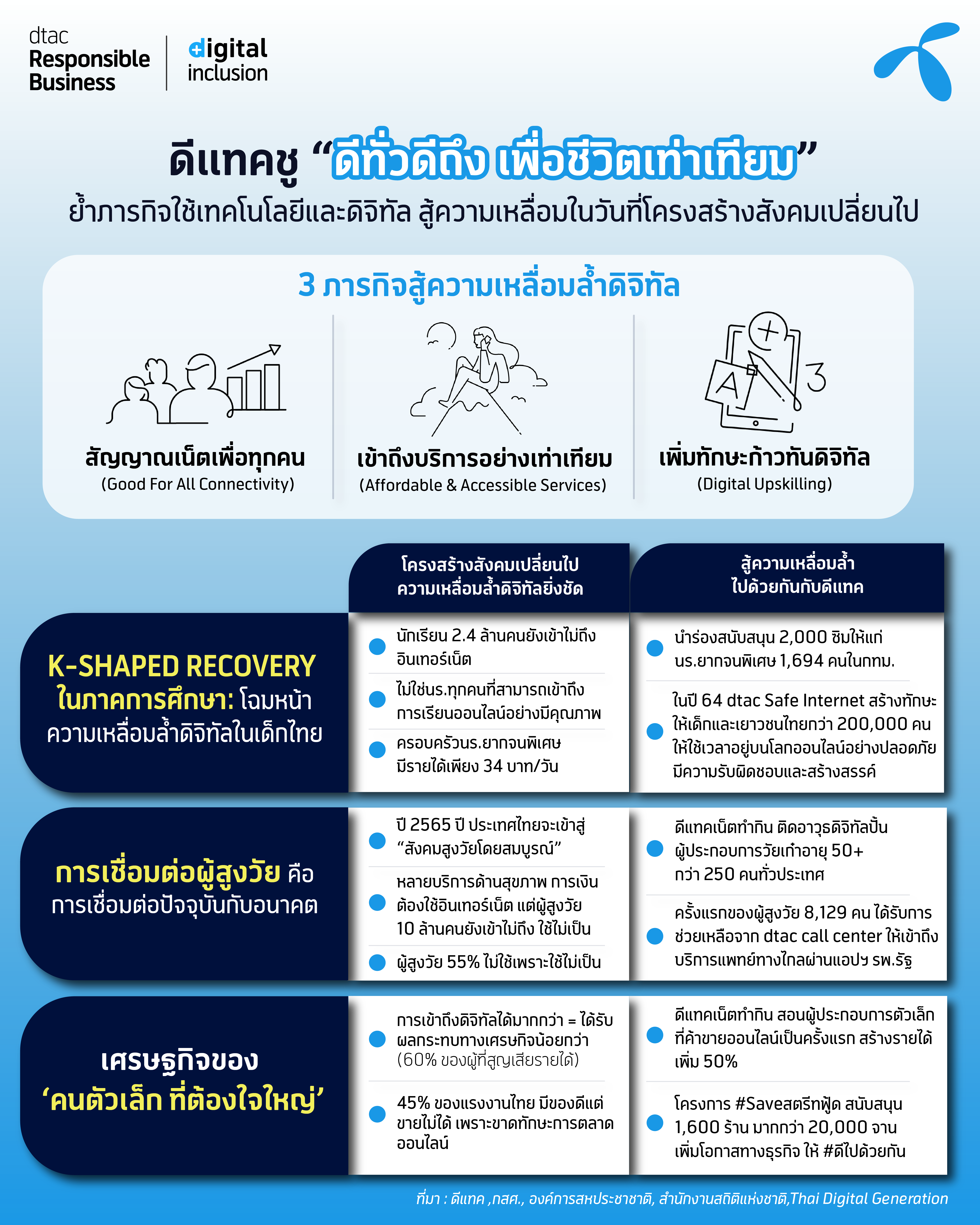 25 พฤศจิกายน 2564 – ดีแทคบอกเล่าภารกิจในช่วงวิกฤตโควิด-19 ผ่านแคมเปญโฆษณา “ดีทั่วดีถึง เพื่อชีวิตเท่าเทียม” ที่มุ่งส่งเสริมกลุ่มคนเปราะบางให้เข้าถึงและสามารถใช้ดิจิทัล เพื่อเข้าถึงโอกาสที่เท่าเทียมกับกลุ่มคนอื่นๆ ในสังคม พร้อมชี้ให้ทุกภาคส่วนในสังคมเห็นถึงความรุนแรง และผลกระทบเชิงลึกของปัญหา “ช่องว่างทางดิจิทัล” ที่กำลังซ้ำเติมโครงสร้างสังคมไทยที่กำลังบอบช้ำด้วยปัญหาความเหลื่อมล้ำ และยังต้องเปลี่ยนผ่านไปให้ทันกับอัตราเร่งของดิจิทัลทั่วโลก