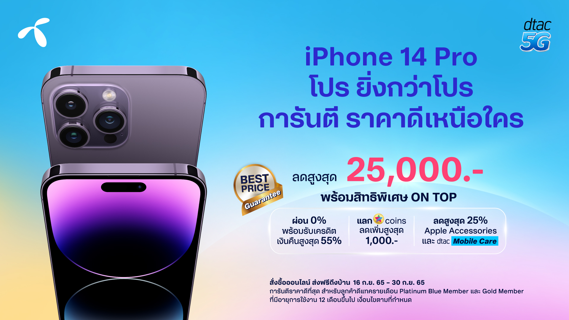 ดูรายละเอียดเพิ่มเติมเกี่ยวกับแพ็กเกจราคาต่างๆ ได้ที่ www.dtac.co.th/apple/iphone-14-pro
