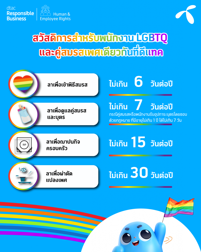 สามารถอ่านรายละเอียดเกี่ยวกับสวัสดิการเท่าเทียมของดีแทคสำหรับพนักงาน LGBTQ ได้ ที่นี่