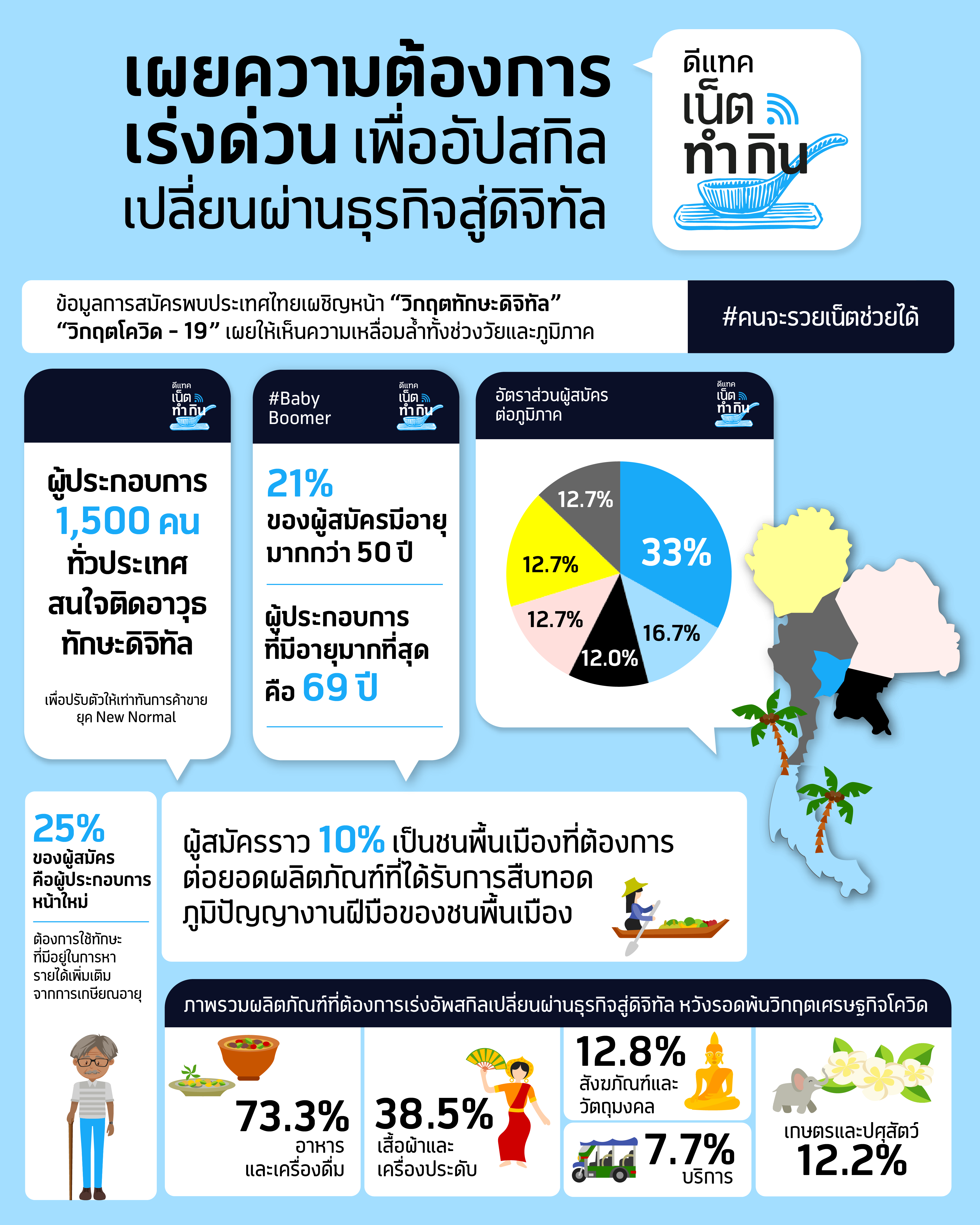 - ร้อยละ 33 ของผู้สมัครอาศัยอยู่ในพื้นที่กรุงเทพฯ และปริมณฑล ตามด้วยภาคเหนือที่ร้อยละ 16.7 ขณะที่ภูมิภาคอื่นๆ มีอัตราส่วนใกล้เคียงกันที่ร้อยละ 12 นอกจากนี้ กว่าร้อยละ 21 ของผู้เข้าสมัครมีอายุมากกว่า 50 ปี โดยมีความต้องการพัฒนาทักษะดิจิทัลและเห็นความสำคัญของการทำธุรกิจออนไลน์