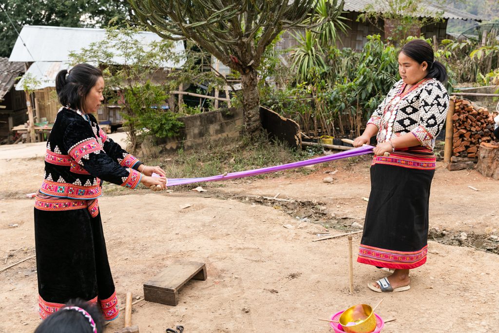 ในช่วงประเพณีกินวอ หรือเทศกาลปีใหม่ของชาวลาหู่ ซึ่งจัดขึ้นเป็นเวลา 12 วัน 12 คืนติดต่อกันเพื่อเฉลิมฉลองและบวงสรวงเทพเจ้าตามความเชื่อแต่โบราณ บรรดาหญิงชายชาวลาหู่จะแต่งกายในชุดชาติพันธุ์ที่ปักทออย่างประณีตเต็มยศ พร้อมแขวน ‘กระเป๋าย่ามลาหู่’ ซึ่งเปรียบเป็นสัญลักษณ์แห่งน้ำเต้าปุงที่นำมาซึ่งความอุดมสมบูรณ์ตามความเชื่อของคนในท้องถิ่น