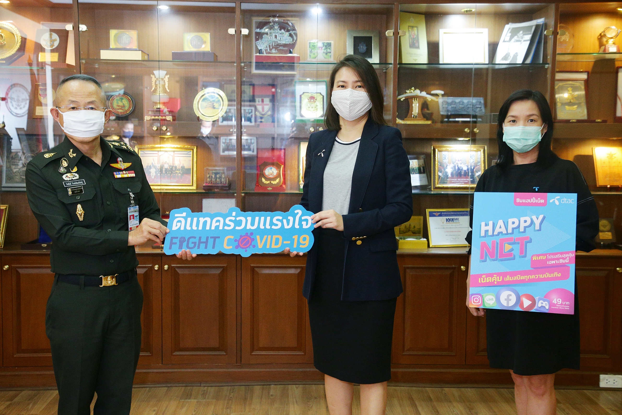 นางอรอุมา ฤกษ์พัฒนาพิพัฒน์ ผู้อำนวยการอาวุโส สายงานสื่อสารและการพัฒนาอย่างยั่งยืน (กลาง) และนางสุกัณณี เลิศสุขวิบูลย์ ผู้อำนวยการอาวุโส สายงานการตลาดระบบเติมเงิน บริษัท โทเทิ่ล แอ็คเซ็ส คอมมูนิเคชั่น จำกัด (มหาชน) หรือดีแทค (ขวา) มอบซิมเน็ตให้คนไทย ที่ต้องอยู่ในพื้นที่กักกันโรคแห่งรัฐ State Quarantine เพื่อสังเกตอาการหลังกลับจากต่างประเทศ 14 วัน ผ่าน พล.อ.รักศักดิ์ โรจน์พิมพ์พันธุ์ ผู้อำนวยการ สำนักนโยบายและแผนกลาโหม กระทรวงกลาโหม (ซ้าย) หน่วยรับผิดชอบ ในการบริหารจัดการให้กับคนไทยที่เดินทางกลับจากต่างประเทศ ด้วยเที่ยวบินพิเศษ