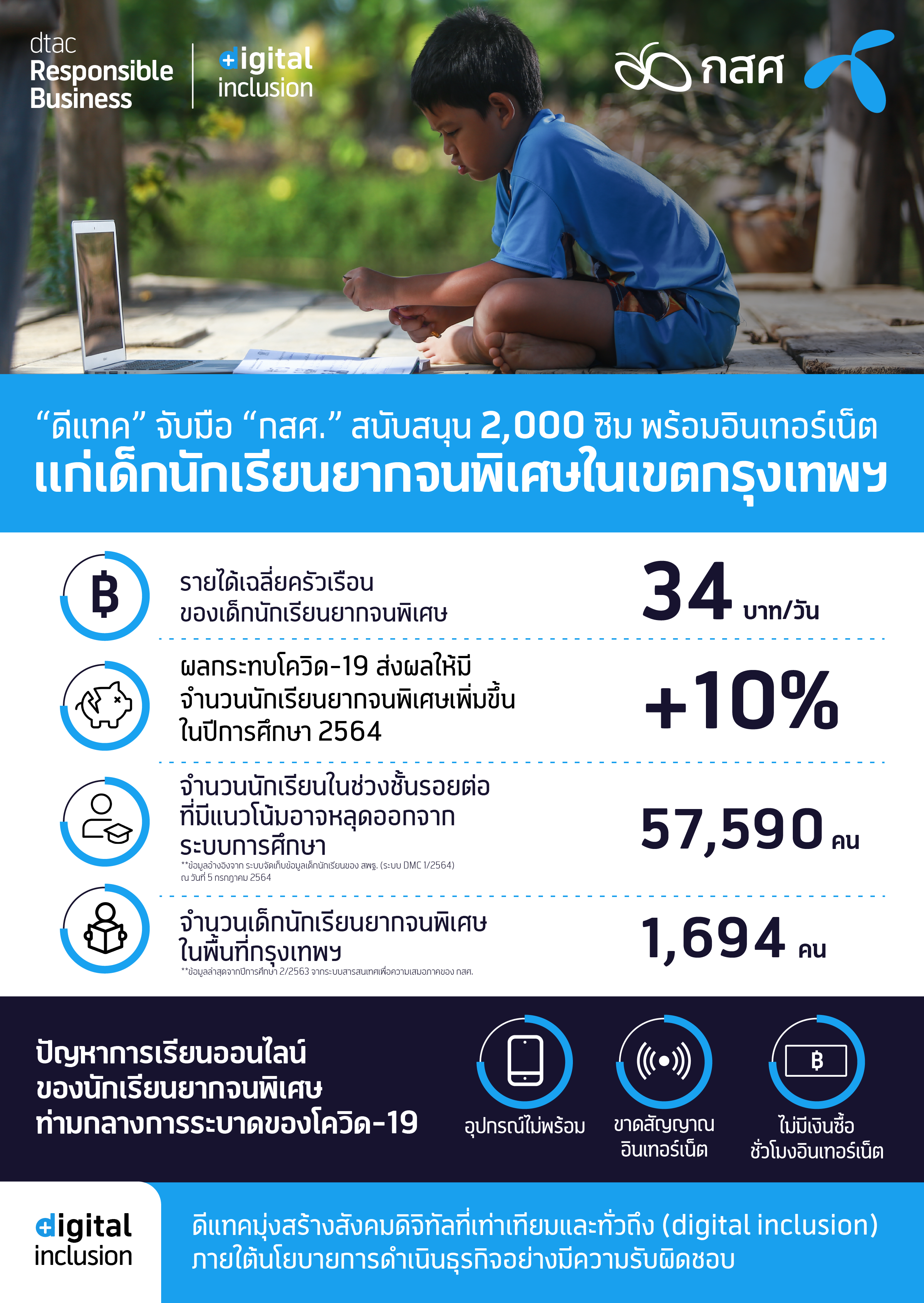 11 สิงหาคม 2564 – “ดีแทค” สนับสนุน 2,000 ซิมพร้อมแพ็กเก็จเน็ตอันลิมิเต็ดความเร็ว 4 Mbps แก่กลุ่มเด็กนักเรียนยากจนพิเศษ ของ กสศ. นำร่องในเขตกรุงเทพฯ สำหรับการเรียนออนไลน์เป็นการเร่งด่วนลดอุปสรรคการเรียนรู้ เตรียมพร้อมหาทางออกระยะยาวในยุคเรียนออนไลน์ มุ่งสู่เป้าหมายความเท่าเทียมทางดิจิทัล (Digital inclusion) ขณะที่ กสศ.เผยพบเด็กเจอปัญหาระหว่างเรียนมากกว่า 2.7 แสนคน ในพื้นที่จังหวัดสีแดงเข้ม ย้ำสัญญาณอินเทอร์เน็ตคือโอกาสทางการเรียนรู้ และลดการปิดกั้นแม้เกิดสถานการณ์โควิด-19