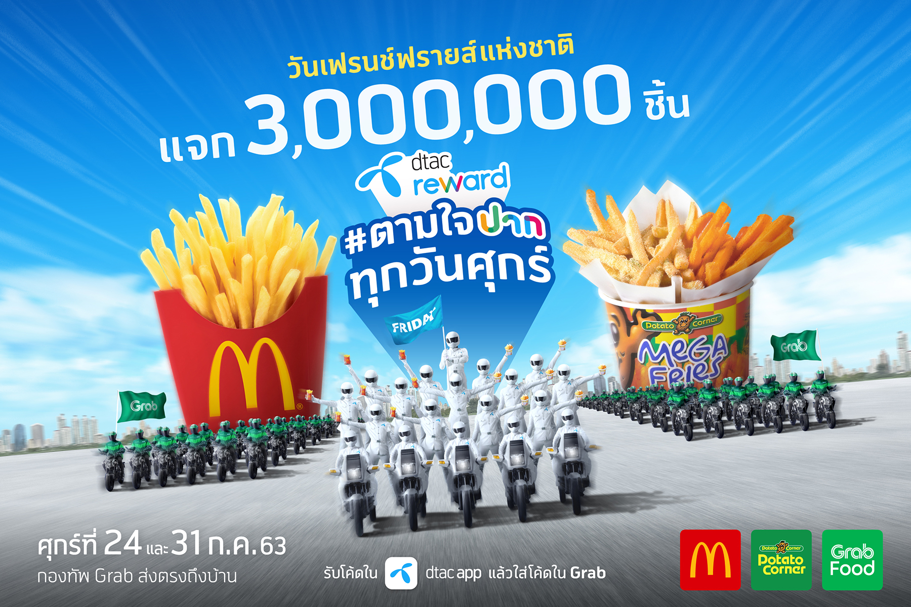 ดีแทค รีวอร์ด ตามใจปากทุกวันศุกร์ ในเดือนกรกฎาคมนี้ ลูกค้าดีแทคจะได้ทานฟรีเฟรนช์ฟรายส์จำนวน 3,000,000 ชิ้น จาก McDonald’s เฟรนช์ฟรายส์ไซซ์ XL และ Potato Corner เฟรนช์ฟรายส์ไซซ์ Mega Fries แจกรวมกันทั้งสิ้น 60,000 สิทธิ์ กดรับโค้ดวันศุกร์ที่ 24 และ 31 กรกฎาคม 2563 ผ่านดีแทค แอป แล้วใช้โค้ดที่ได้รับมาสั่งผ่านแอป GrabFood แล้วนั่งรออยู่ที่บ้าน กองทัพ Grab ส่งตรงถึงที่ ให้คนไทยได้ยิ้มอร่อยทั้งประเทศ ลูกค้าที่ยังไม่มีดีแทค แอป สามารถดาวน์โหลดเตรียมให้พร้อม รอกดรับสิทธิ์จะได้ไม่พลาด สำหรับโค้ดที่กดรับทุกวันศุกร์ สามารถเก็บไว้ใช้ได้นานถึง 7 วัน โดยนับจากวันศุกร์ที่กดรับโค้ด