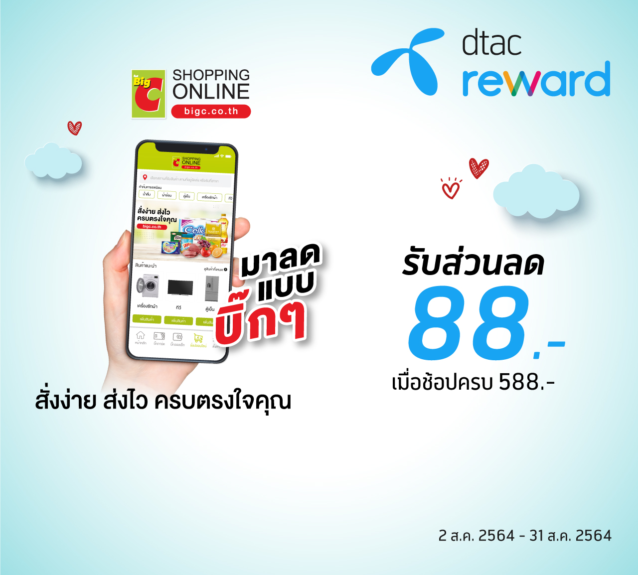 11 สิงหาคม 2564 – ดีแทค รีวอร์ด จัดสิทธิพิเศษ ‘สิงหาพาแม่สุข’ กับดีลเอาใจคุณแม่ มอบส่วนลดอิ่มอร่อยและช้อปปิ้ง แม้ว่าจะอยู่ในช่วงล็อกดาวน์ แต่ดีแทคยังคงจัดสิทธิพิเศษให้ลูกค้าอย่างต่อเนื่อง โดยเฉพาะในโอกาสวันแม่ ปีนี้ดีแทคได้จัดสิทธิพิเศษ สิงหาพาแม่สุข ให้คุณแม่มีความสุขและปลอดภัย ตลอดทั้งเดือนสิงหาคม ดังนี้