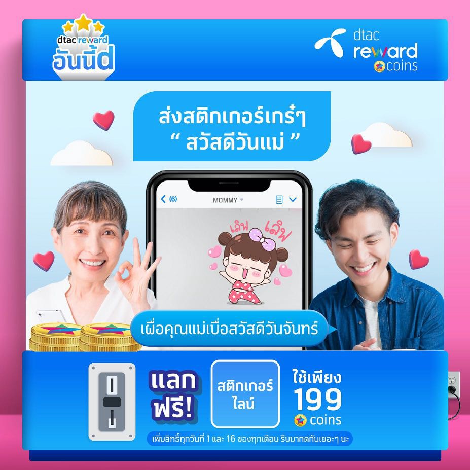 • ส่งสติ๊กเกอร์ไลน์เก๋ๆ สวัสดีวันแม่ เผื่อคุณแม่เบื่อสวัสดีวันจันทร์ ใช้เพียง 199 dtac reward coins แลกฟรีสติกเกอร์ไลน์