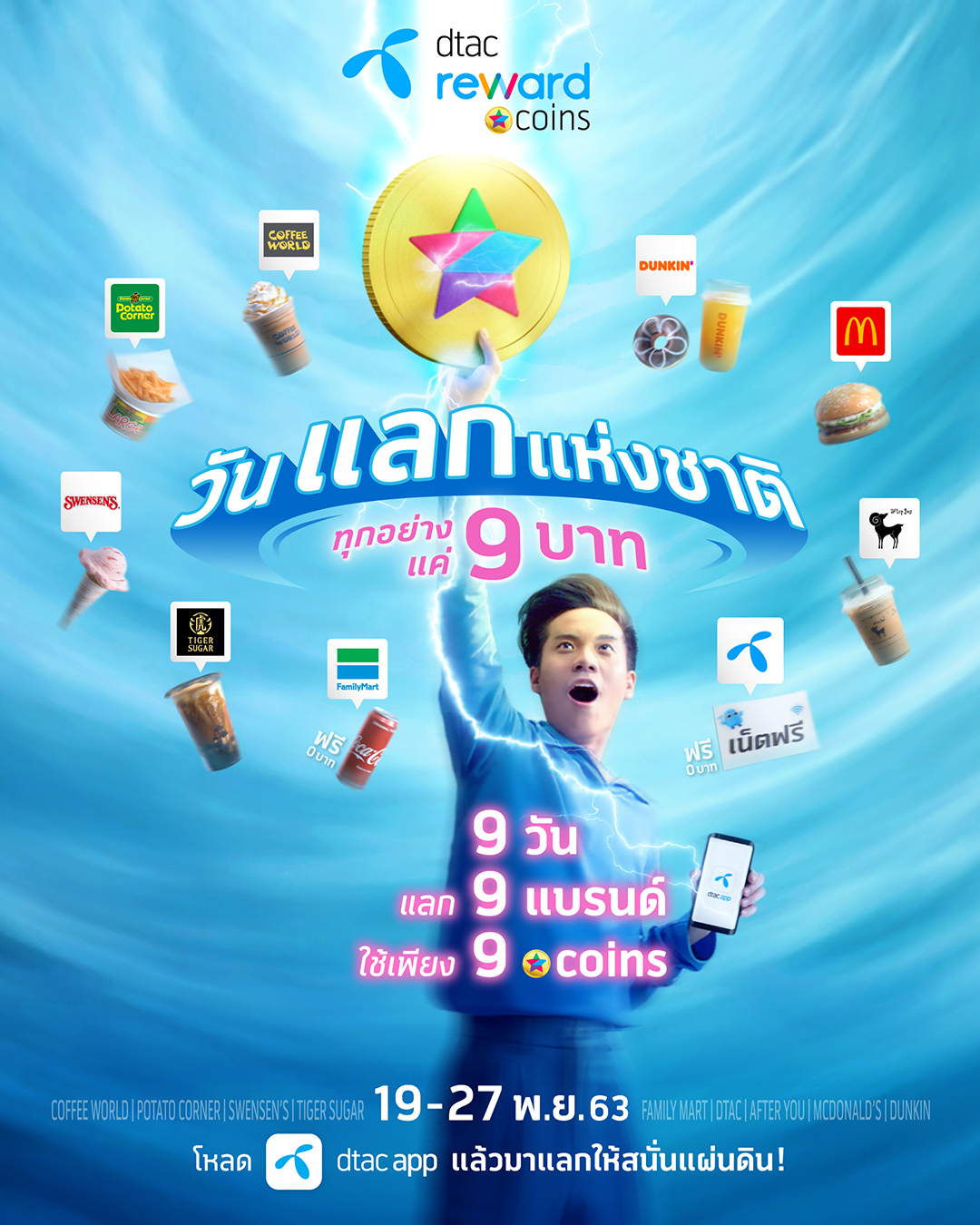17 พฤศจิกายน 2563 – ดีแทคเดินเกมรุกบริหารความสุขให้ลูกค้า ใช้ดีแทค รีวอร์ด มัดใจมอบสิทธิพิเศษเพิ่มเติมให้กับผู้ใช้บริการทั้งระบบเติมเงินและรายเดือน ที่ทำธุรกรรมผ่านทางดีแทคแอป ให้สะสมเหรียญ coins จากดีแทค รีวอร์ด สะสมง่าย แลกใช้คุ้มได้ตามใจ ในวิถีชีวิตแบบ New Normal ทำให้ผู้ใช้บริการดีแทค เริ่มคุ้นชินและเข้ามาใช้บริการบนออนไลน์มากขึ้น เห็นได้จากการเติบโตของการใช้งานดีแทค แอปพลิเคชัน ซึ่งสิทธิประโยชน์ที่ดีแทค รีวอร์ด coins ให้จากดีแทคแอปจะเป็นช่องทางใหม่ให้ลูกค้าได้รับความสนุกและสะดวกสบายมากยิ่งขึ้น ในโอกาสพิเศษฉลองเปิดตัวดีแทค รีวอร์ด coins รับโบนัสพิเศษ 9 วัน 9 แบรนด์ 9 เหรียญ ในวันที่ 19 – 27 พฤศจิกายน 2563
