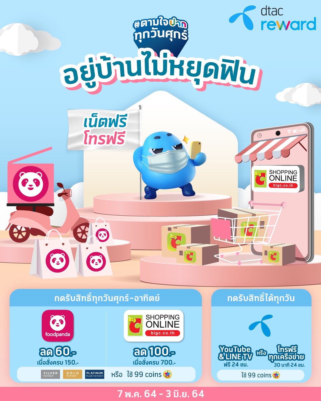 ในช่วงเดือนพฤษภาคม ถึง มิถุนายน ที่มีการ work From Home me ดีแทค รีวอร์ดได้จัดสิทธิพิเศษ ดูแลลูกค้าที่ทำงานอยู่ที่บ้านให้ปลอดภัยห่างไกลโควิด-19 ภายใต้แคมเปญตามใจปากทุกวันศุกร์ ผ่านช่องทางดีแทค แอป สำหรับลูกค้า Silver Member/Gold Member/Platinum Blue Member หรือใช้เพียง 99 Coins รับส่วนลด 60 บาท เมื่อสั่งอาหารผ่าน foodpanda ครบ150 บาท และรับส่วนลด 100 บาท เมื่อช้อปปิ้งออนไลน์จาก Big C Shopping Online ครบ 700 บาท เริ่มตั้งแต่วันที่ 7 พ.ค. – 3 มิ.ย. 2564 กดรับสิทธิ์ทุกวันศุกร์ถึงวันอาทิตย์