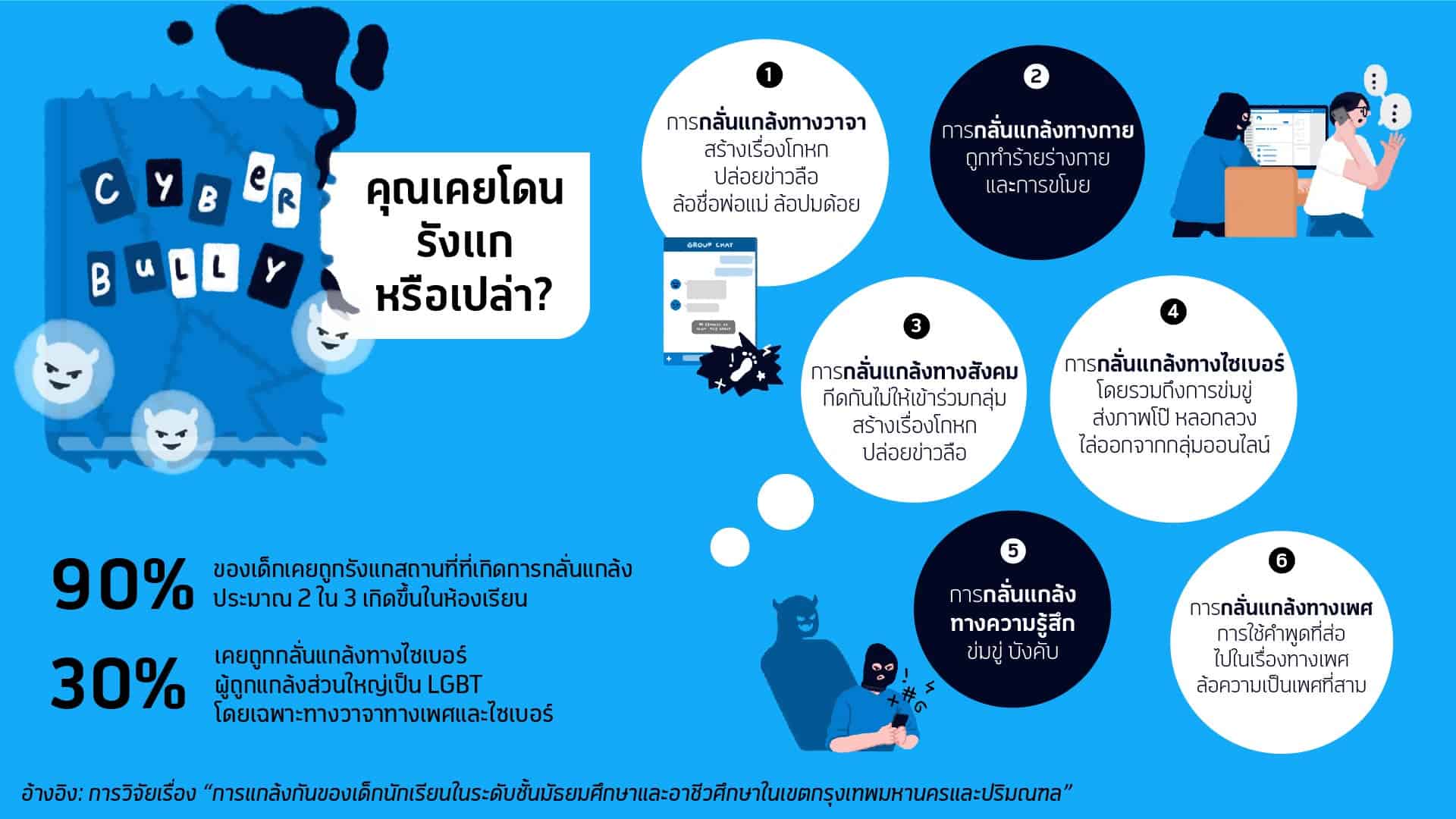 จากงานวิจัยเรื่อง “การแกล้งกันของเด็กนักเรียนในระดับชั้นมัธยมศึกษาและอาชีวศึกษาในเขตกรุงเทพมหานครและปริมณฑล” พบว่า การกลั่นแกล้งทางสังคมมีความสัมพันธ์ที่สูงกับการกลั่นแกล้งทางไซเบอร์ แสดงให้เห็นว่า เด็กนักเรียนใช้โซเชียลมีเดียเป็นส่วนหนึ่งของสังคมพวกเขา ทำให้การกลั่นแกล้งทางออนไลน์จัดเป็นปัญหาใหม่สำหรับประเทศไทย