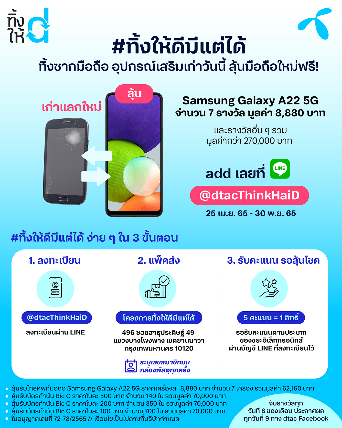 ดีแทคเชิญชวนลูกค้าทุกเครือข่ายร่วม #ทิ้งให้ดีมีแต่ได้ นำซากขยะอิเล็กทรอนิกส์และอุปกรณ์ไอทีขนาดเล็ก อาทิ โทรศัพท์มือถือ แทบเล็ต สมาร์ทวอชท์ แบตเตอรี่สำรอง หูฟัง และอุปกรณ์เสริมต่าง ๆ มา #ทิ้งให้ดีมีแต่ได้ โดยดีแทคอาสาเป็นผู้นำซากขยะอิเล็กทรอนิกส์เก่าเหล่านี้ เข้าสู่ระบบรีไซเคิลอย่างถูกวิธี ไม่ให้มีการฝังกลบ ลุ้นรับมือถือและรางวัลอื่น ๆ รวม 1,197 รางวัล