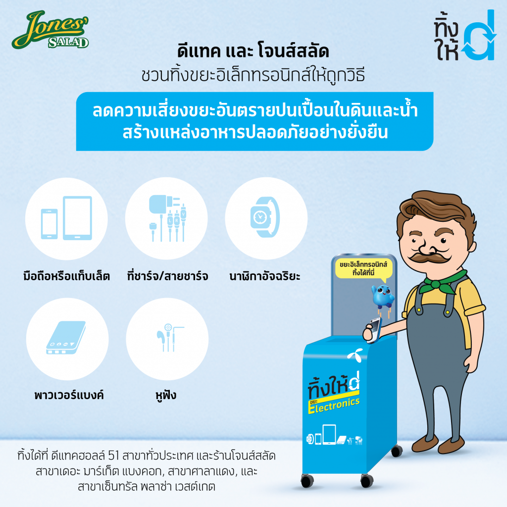 นายชารัด เมห์โรทรา ประธานเจ้าหน้าที่บริหาร บริษัท โทเทิ่ล แอคเซ็ส คอมมูนิเคชั่น จำกัด มหาชน กล่าวว่า “ดีแทคมีความยินดีและขอขอบคุณที่โจนส์สลัดร่วมกำหนดเป้าหมายไปกับเราในการจัดการขยะอิเล็กทรอนิกส์อย่างมีความรับผิดชอบต่อผู้บริโภคและเพื่อนร่วมโลก ขยะที่เราจะจัดเก็บร่วมกับโจนส์สลัดจะเป็นสัดส่วนสำคัญจากเป้าหมายที่เราตั้งใจจะจัดเก็บซากมือถือและอุปกรณ์เชื่อมต่อให้ได้รวม 50,000 ชิ้นภายในสิ้นปีนี้ แต่ก็ยังถือว่าเป็นสัดส่วนที่น้อยมาก เมื่อเปรียบเทียบกับขยะอิเล็กทรอนิกส์ที่จะเกิดขึ้นทั้งหมดในระบบ ทั้งนี้ การจัดการขยะอิเล็กทรอนิกส์อย่างมีความรับผิดชอบถือเป็นเป้าหมายสำคัญตามแผนงานการจัดการผลกระทบด้านสิ่งแวดล้อมและสภาวะอากาศ (Environment Management System and Climate) ของกลยุทธ์ด้านความยั่งยืนที่ดีแทค นอกจากขยะประเภทซากมือถือและอุปกรณ์เสริมที่ดีแทคจัดเก็บจากลูกค้าและผู้ใช้งานทั่วไปแล้ว”