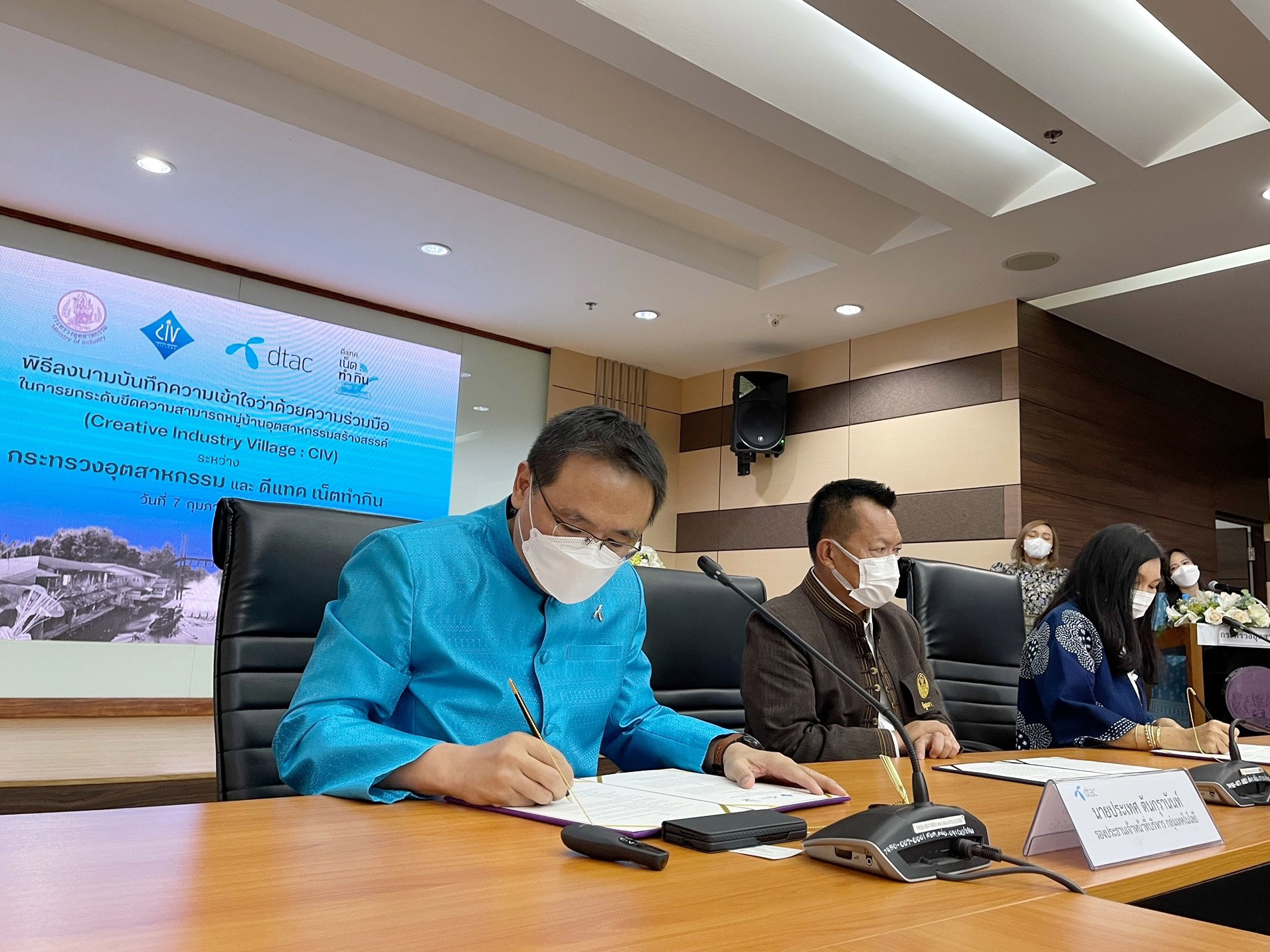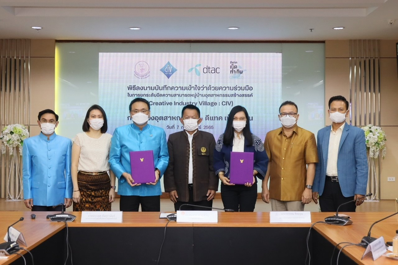 7 กุมภาพันธ์ 2565 – กระทรวงอุตสาหกรรมและดีแทคร่วมลงนามบันทึกความเข้าใจว่าด้วยความร่วมมือในการยกระดับขีดความสามารถหมู่บ้านอุตสาหกรรมสร้างสรรค์ (Creative Industry Village: CIV) เพื่อฟื้นฟูและยกระดับเศรษฐกิจชุมชน ดีแทคเน็ตทำกินร่วมพัฒนาศักยภาพผู้ประกอบการในชุมชน นำเทคโนโลยีดิจิทัลมาประยุกต์ใช้ในการจัดการธุรกิจสินค้าชุมชนที่มากด้วยอัตลักษณ์ให้ 152 หมู่บ้านจาก 76 จังหวัด เพิ่มมูลค่าทางเศรษฐกิจให้อุตสาหกรรมท่องเที่ยวเชิงวัฒนธรรมผ่านวิถีความเป็นไทย ต่อยอดด้วยนวัตกรรมสมัยใหม่เพื่อความยั่งยืน