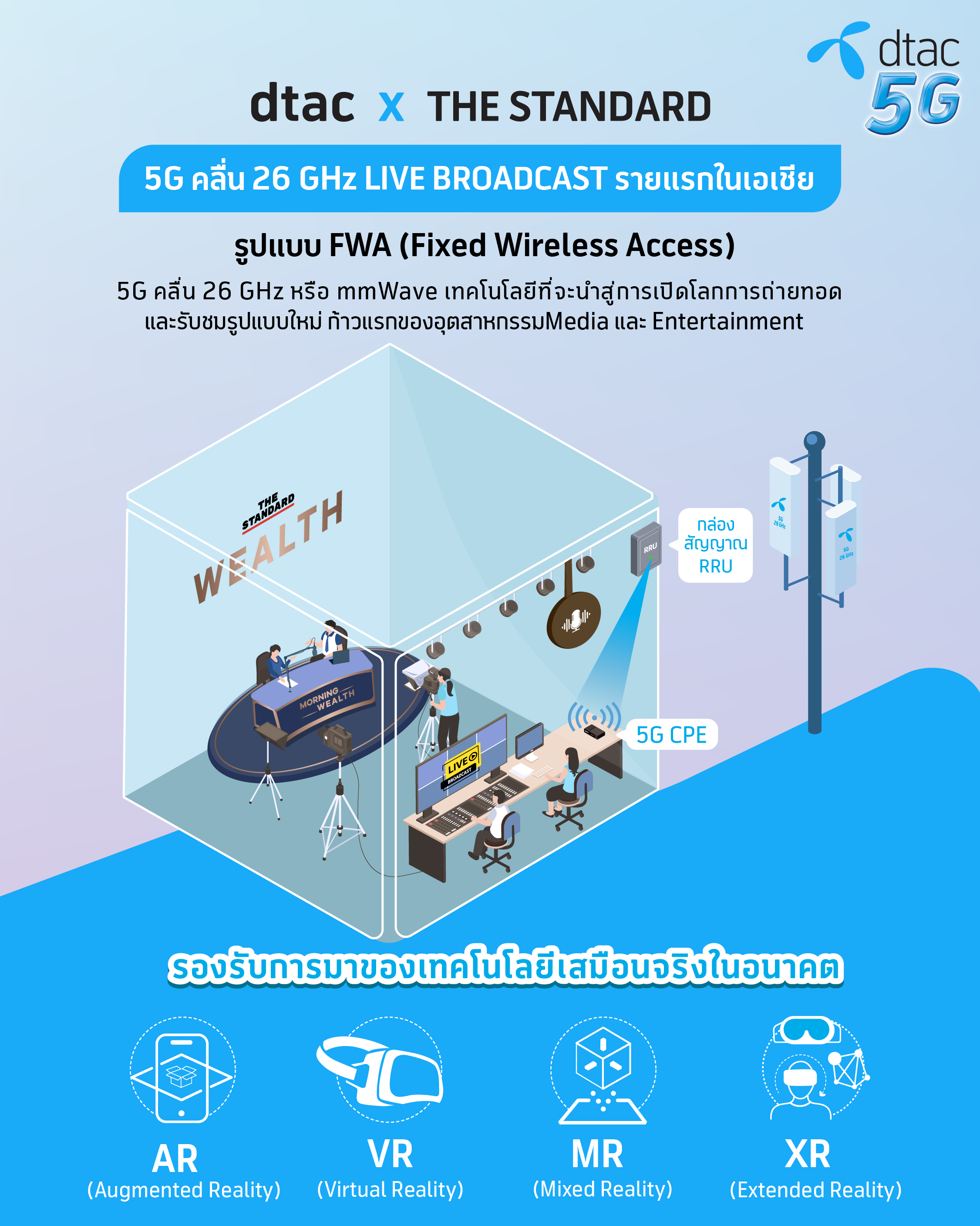 1 เมษายน 2564 – ดีแทค เดินหน้านำเทคโนโลยี 5G เปลี่ยนแปลงภาคอุตสาหกรรม จับมือ THE STANDARD นำ 5G รูปแบบ FWA (Fixed Wireless Access) หรือ อินเทอร์เน็ตไร้สายความเร็วสูงประจำที่ เข้าไปใช้ในการถ่ายทอดสดเป็นครั้งแรกในเอเชียด้วยคลื่น 26 GHz หรือ mmWave โดยนำมาใช้งานถ่ายทอดรายการ MORNING WEALTH ทาง THE STANDARD WEALTH หนุนอุตสาหกรรมมีเดียและบรอดคาสต์ ดีแทคเดินหน้าลุย 5G ต่อเนื่องนำบริการใหม่มาให้บริการในเชิงพาณิชย์ ทั้งรูปแบบ สมาร์ทซิตี้ เกษตรอัจฉริยะ โซลูชั่นบริหารพลังงานอัจฉริยะ และระบบติดตามรักษาความปลอดภัยอัจฉริยะ