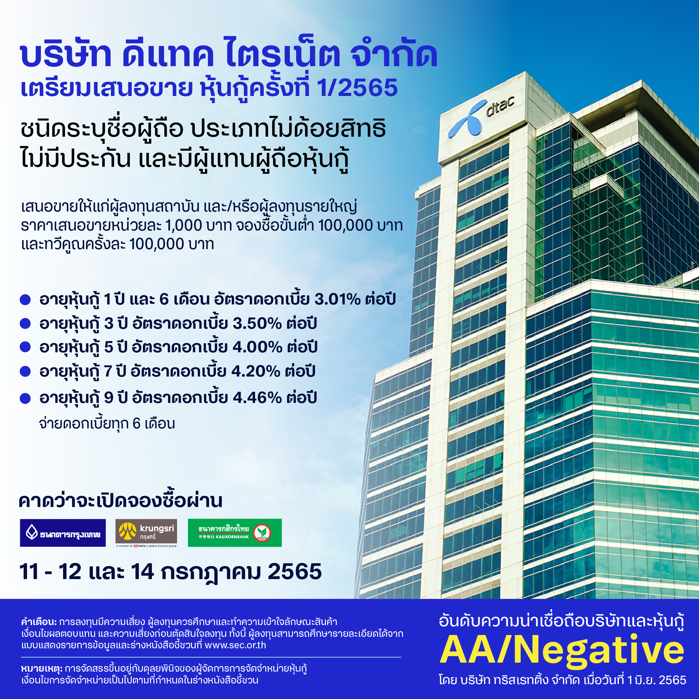 5 กรกฎาคม 2565 – บริษัท ดีแทค ไตรเน็ต จำกัด หรือ DTN บริษัทย่อยของดีแทค ประกอบธุรกิจให้บริการโทรคมนาคม กำหนดอัตราผลตอบแทนหุ้นกู้ชุดใหม่ ที่ 3.01 – 4.46% ต่อปี โดยคาดว่าจะเสนอขายระหว่างวันที่ 11 – 12 และวันที่ 14 กรกฎาคมนี้ ให้แก่ผู้ลงทุนสถาบันและ/หรือผู้ลงทุนรายใหญ่ โดยบริษัทได้รับการจัดอันดับความน่าเชื่อถือที่ระดับ “AA” เครดิตพินิจแนวโน้ม “ลบ” โดยบริษัท ทริสเรทติ้ง จำกัด โดยมีธนาคารกรุงเทพ ธนาคารกรุงศรีอยุธยา และธนาคารกสิกรไทย เป็นผู้จัดการการจัดจำหน่ายหุ้นกู้