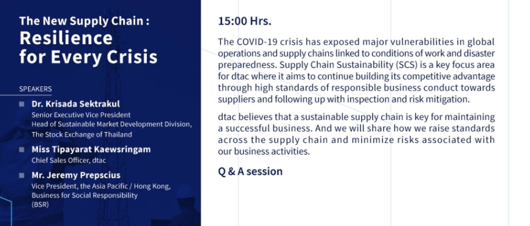 May 27, 2021 – dtac unveiled three megatrends in the post-pandemic economy – a critical need for scale and efficiency, the threat of a widening digital divide, and the growing impact of climate change on supply chain sustainability. In response, the company announced its strategy to rethink business resilience and commit to responsible business practices.