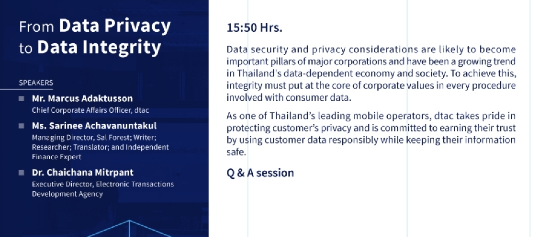 Marcus Adaktusson, Chief Corporate Affairs Officer at dtac, said, “Companies are heavily reliant on data to build new products and services. As such, dtac welcomes the implementation of a national framework around personal data usage by businesses. Its success will hinge on the clarity around its key provisions and the consistency of its application across all sectors. If the standards and expectations are well defined, it will also support a better understanding from consumers as to how their data is used.”