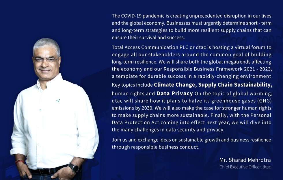 Sharad Mehrotra, chief executive officer of Total Access Communication Plc or dtac, said in the dtac Responsible Business virtual forum 2021 that, “The COVID-19 outbreak has proven how truly inspiring human resilience is, as we saw in the significant growth in the adoption of digital channels. But Thailand is now faced with the formidable challenge of rethinking business resilience for the post-pandemic economy. Businesses must be faster to change, less easily disrupted, and built on sustainable models that benefit all their stakeholders.”