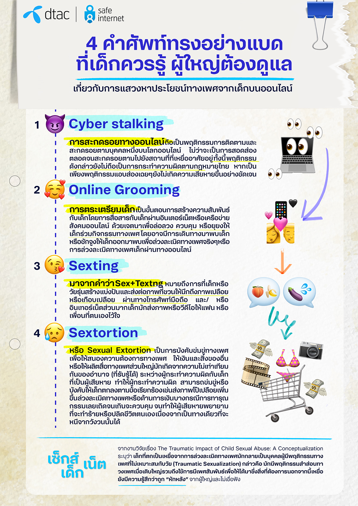 To mark National Children’s Day 2023, dtac Safe Internet would like to bring the following four terms to the attention of children, youth, and their parents so that they get some ideas about how the ill-intentioned have lured their young victims on the internet.