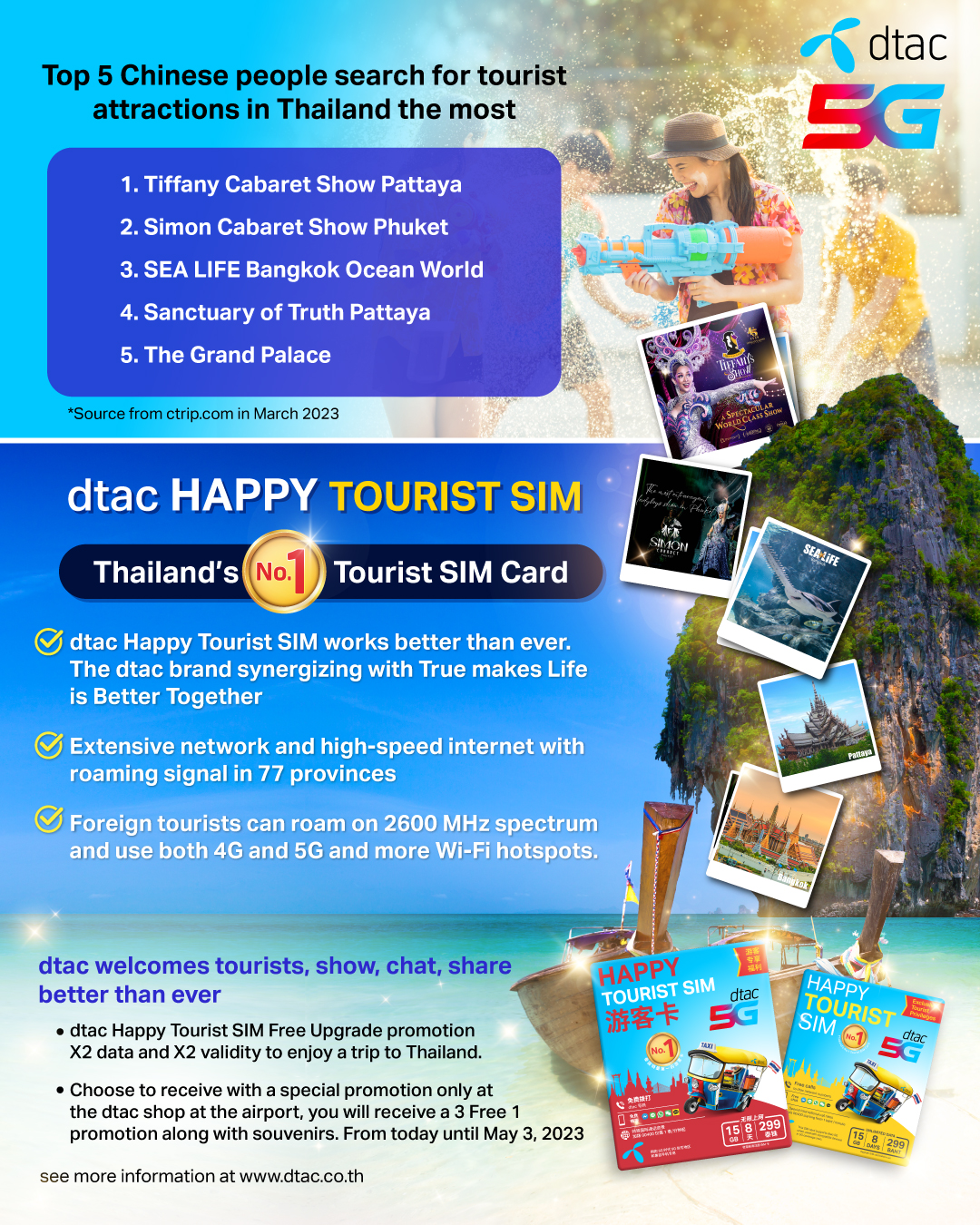 12 April 2023 – dtac welcomes Chinese tourists flocking to celebrate the Thai Songkran festival in mid-April and Chinese Labor Day at the end of the month. In April, up to 300,000 Chinese tourists are expected to arrive out of up to 2 million overseas visitors. Statistically, dtac Happy Tourist SIM is the Number 1 SIM in the Chinese tourist market in Thailand and to celebrate this success, dtac is launching a promotional campaign to level up the tourist experience in Thailand with faster connectivity, better coverage, and more available data.