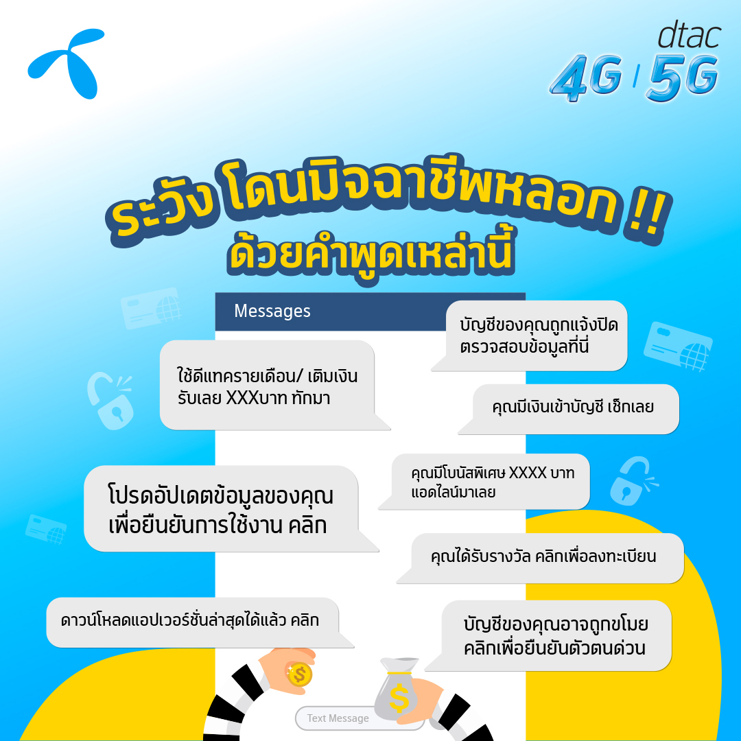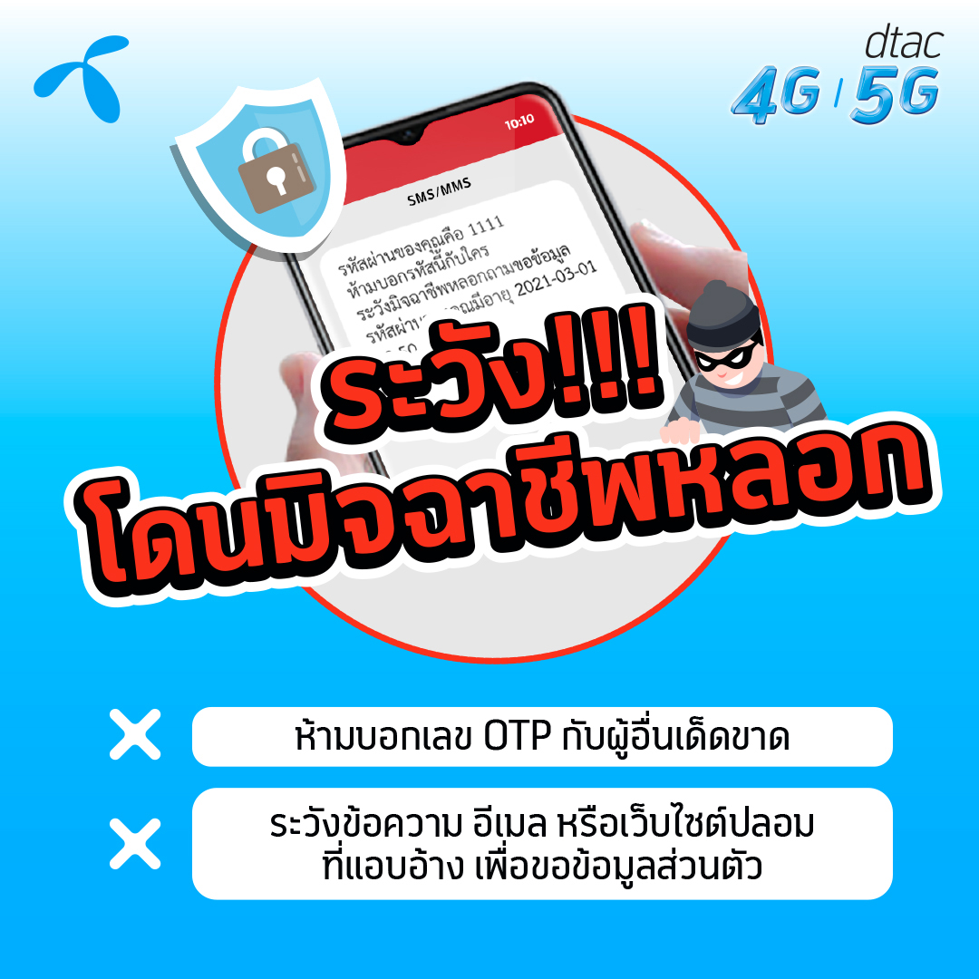 April 27, 2021 – dtac is warning its customers to be cautious of scammers and phishing attempts to obtain personal One-Time Passwords or OTP from users. Impersonators will usually pretend to be an acquaintance or company representative and will ask for the OTP the customer has just received. This can lead to monetary loss for the customer. dtac has therefore added a warning message to OTPs sent by SMS which reminds customers to never share their OTP with anyone else.