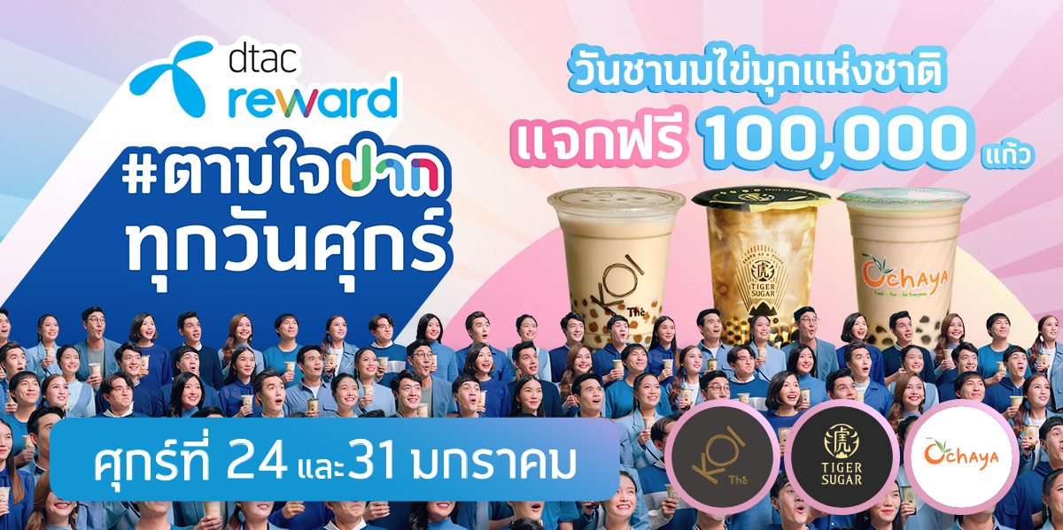 January 22, 2020 – dtac reward emphasizes the position as a leader in offering special deals on food and drinks in Thailand with the latest campaign ‘Tam jai pak took wan suk’ (ตามใจปากทุกวันศุกร์). Surprising offers including discounts, redemptions, and giveaways of beverages, ice cream, and desserts will be given to customers every Friday throughout 2020. Free bubble tea will be the first surprise of this campaign. On Friday 24th and 31st January, more than 100,000 cups of bubble tea, with a total value of over 5 million baht, will be offered for free.