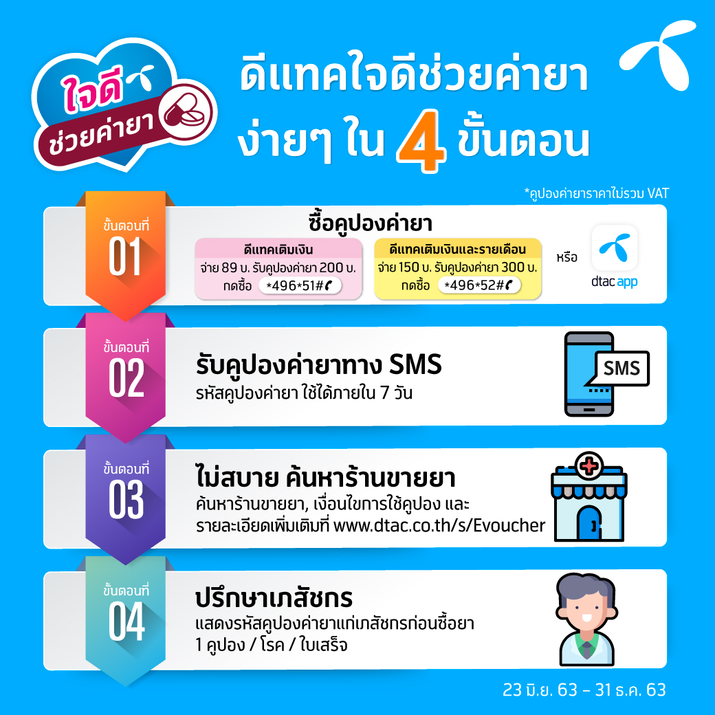 June 29, 2020 – Due to growing health concerns and financial hardship, dtac is tackling the issues of self-medication and fake drugs. The Jaidee pharmacy vouchers are valid at participating pharmacies and can be purchased at discounts of up to 50%.