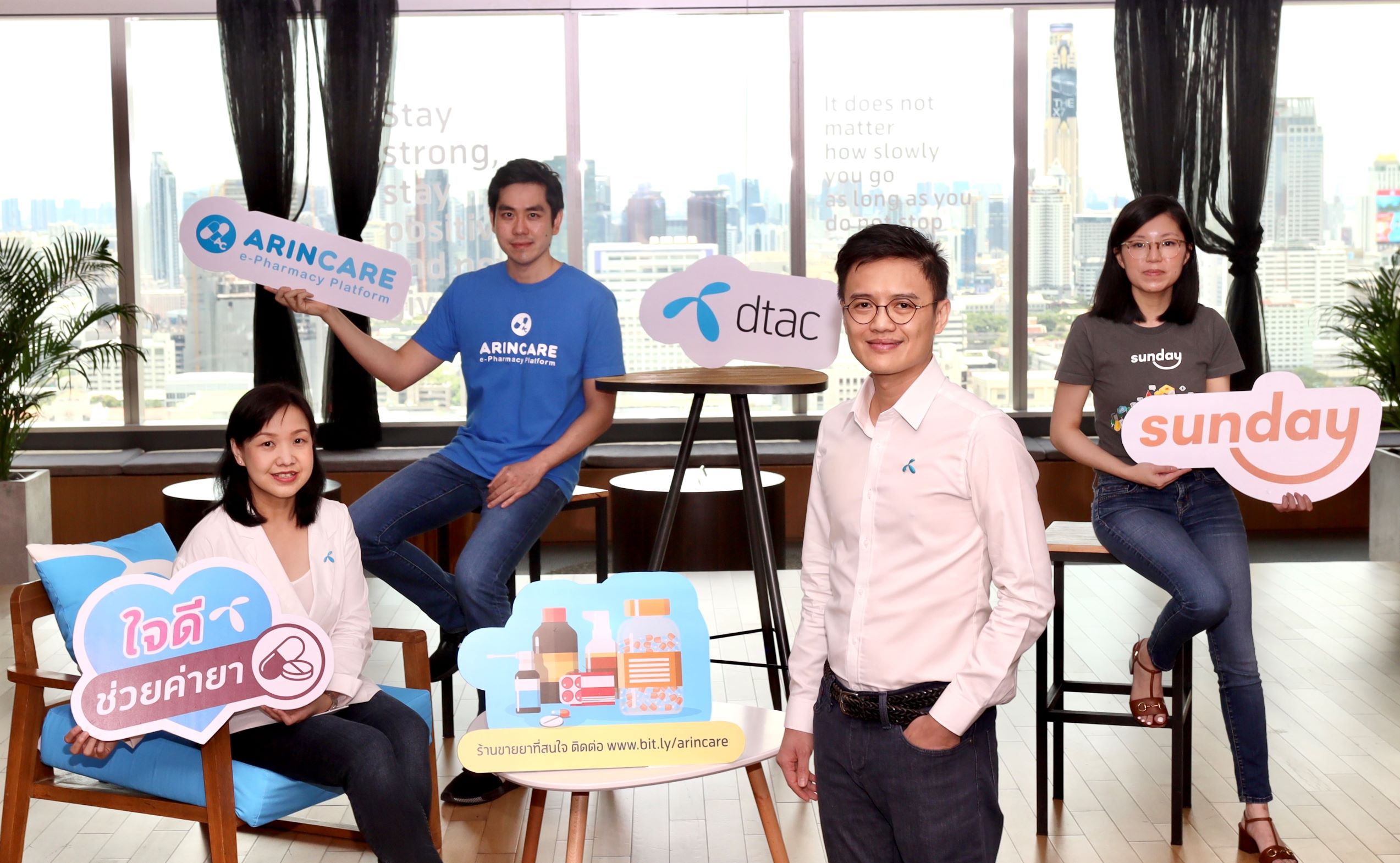 How Lih Ren, Chief Marketing Officer (2nd from right), and Sukannee Lertsukwibul, Head of Prepaid Market and Product at Total Access Communications Plc or dtac (left) Cindy Kua, Chief Executive Officer and co-founder of Sunday Ins Co (right), and Teera Kanokkanjanarat, CEO and co-founder of Arincare Co (2nd from left), launch Jaidee Pharmacy vouchers make customer visits to a licensed pharmacist more affordable.The campaign is initiated by dtac in collaboration with insurance tech startup Sunday Ins and a digital platform for pharmacists and drugstore, Arincare.