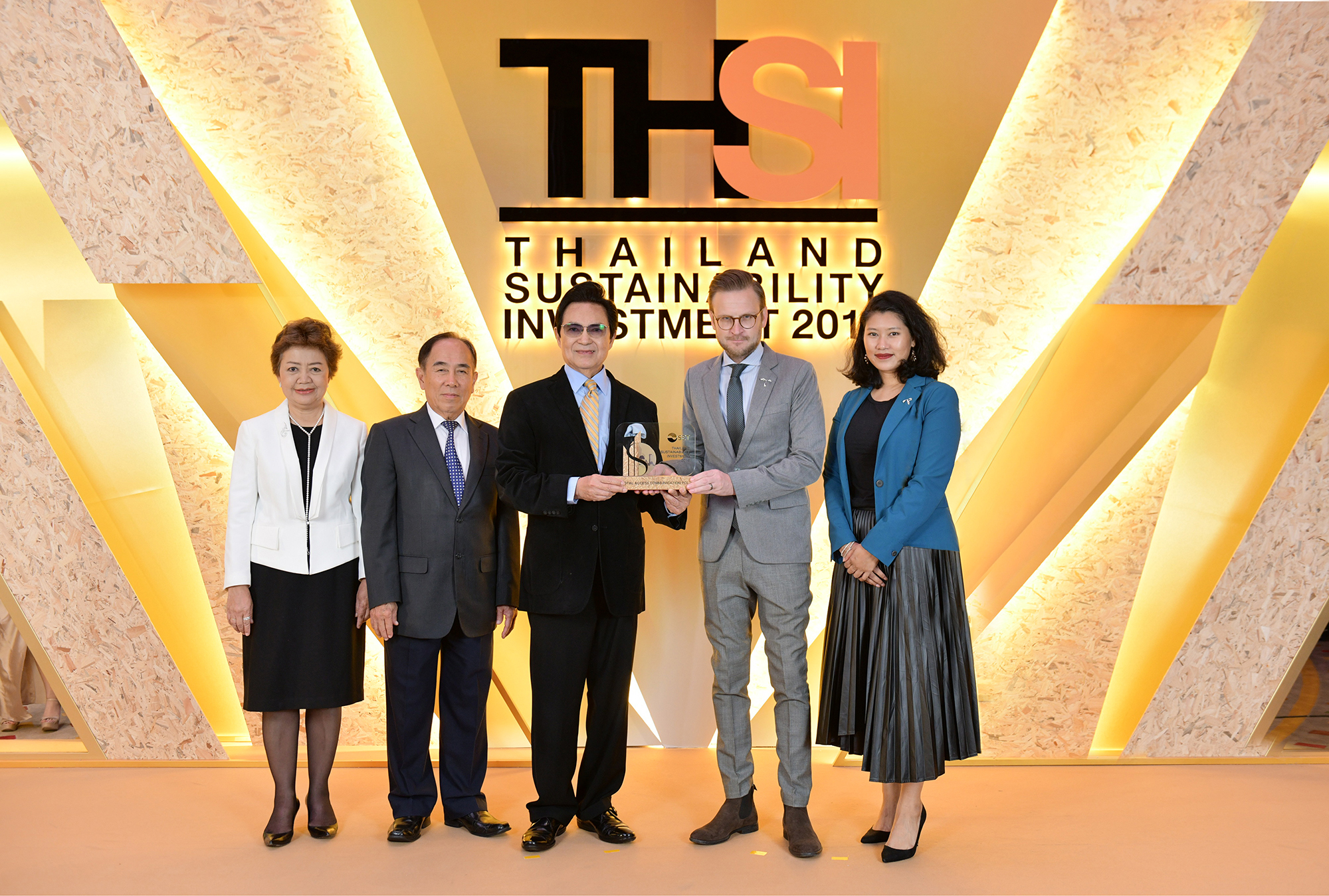 Marcus Adaktusson, Chief Corporate Affairs officer at Total Access Communication Plc or dtac (2nd from right), yesterday received the Sustainability Awards 2019 from Pakorn Peetathawatchai, president of the Stock Exchange of Thailand (SET) (3rd from left) for demonstrating its outstanding performance on environment, social and governance (ESG) aspects on the Thailand Sustainability Investment (THIS) list this year.
