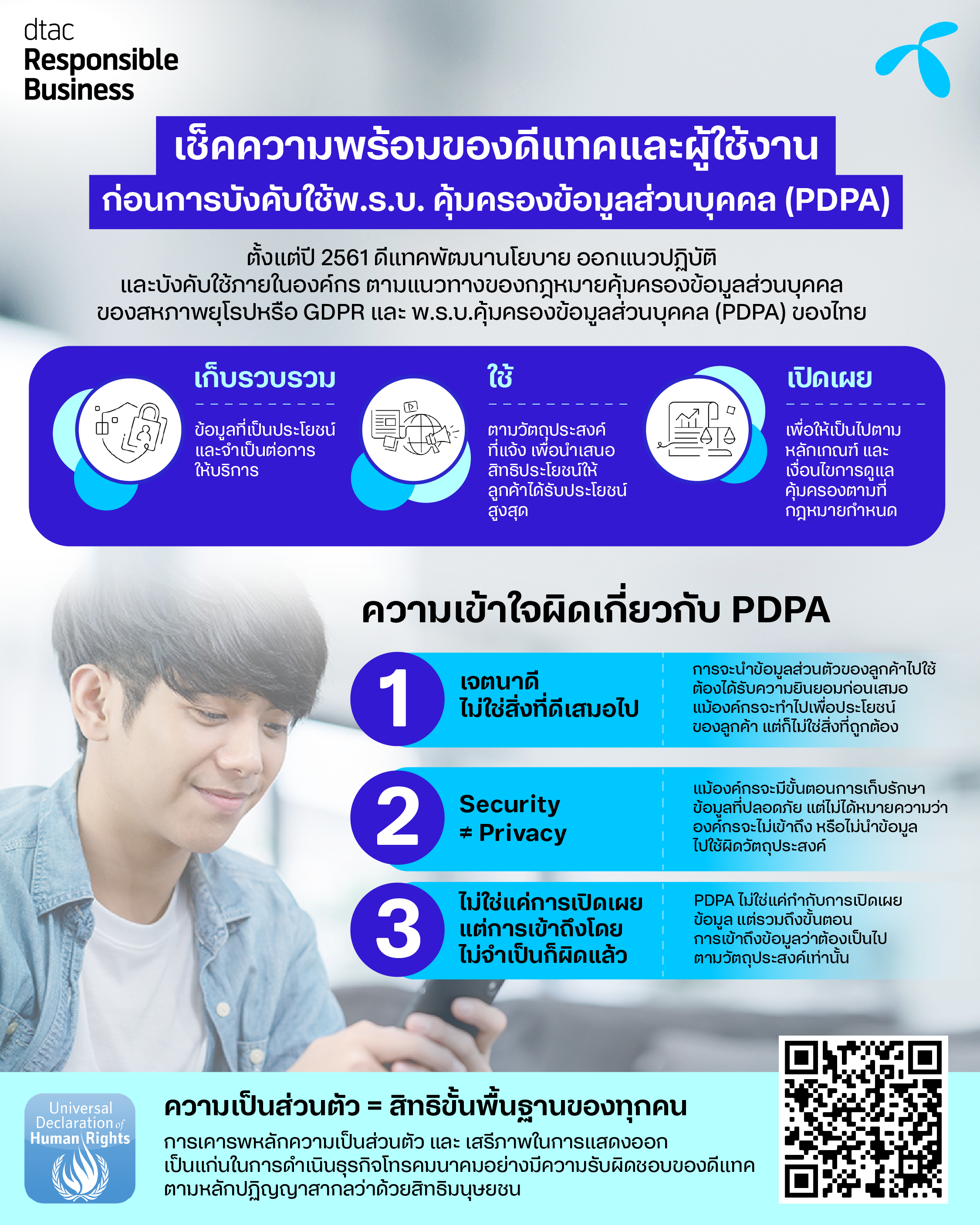 Our digital society provides endless opportunities, but also creates a need for secure data handling. Privacy is one of dtac’s top priorities when we develop our services. In addition, our privacy policy reaffirms dtac’s strong principles in governance and human rights delivered through secured, inclusive and accessible connectivity. Here is how we conduct responsible business https://www.dtac.co.th/sustainability/en/rb