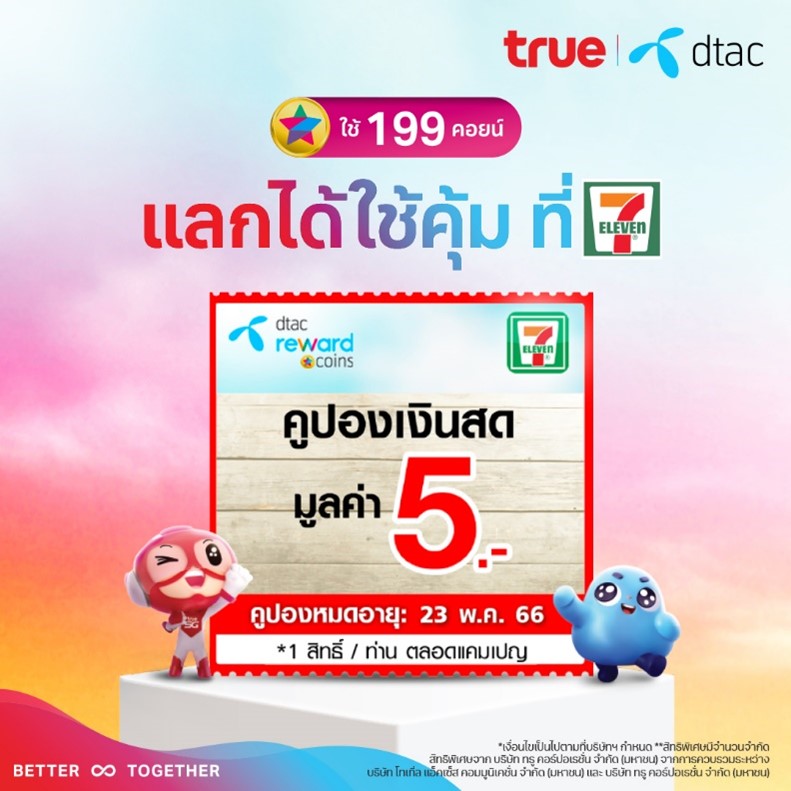 - 7-Eleven dtac customers can use only 199 coins from the regular 499 coins to redeem discount coupon worth 5 baht at 7-Eleven during May 24th-June 23rd, 2023.