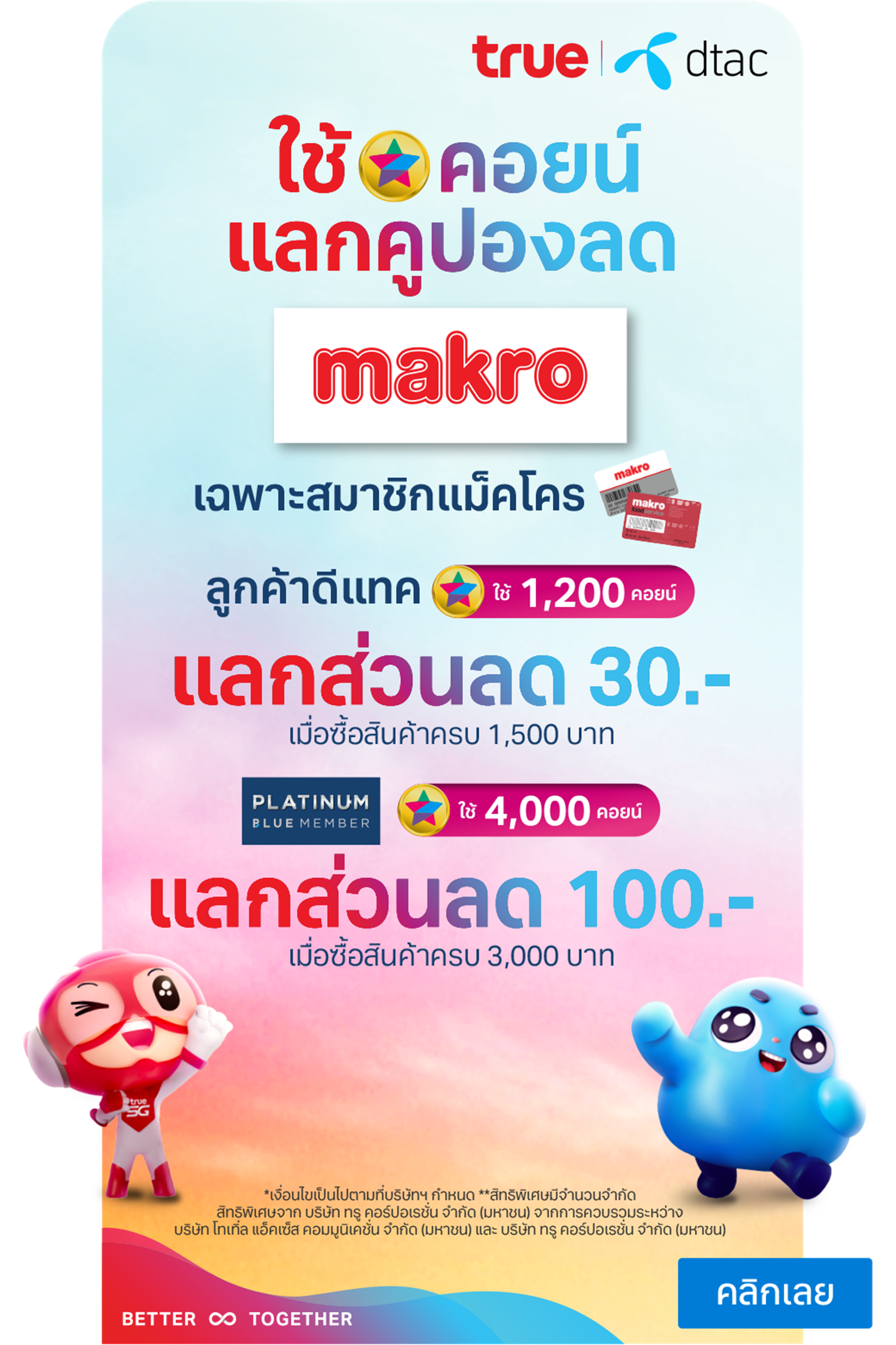 - Makro dtac customers use 1,200 coins to redeem 30 baht discount when shopping up to 1,500 baht at Makro.
