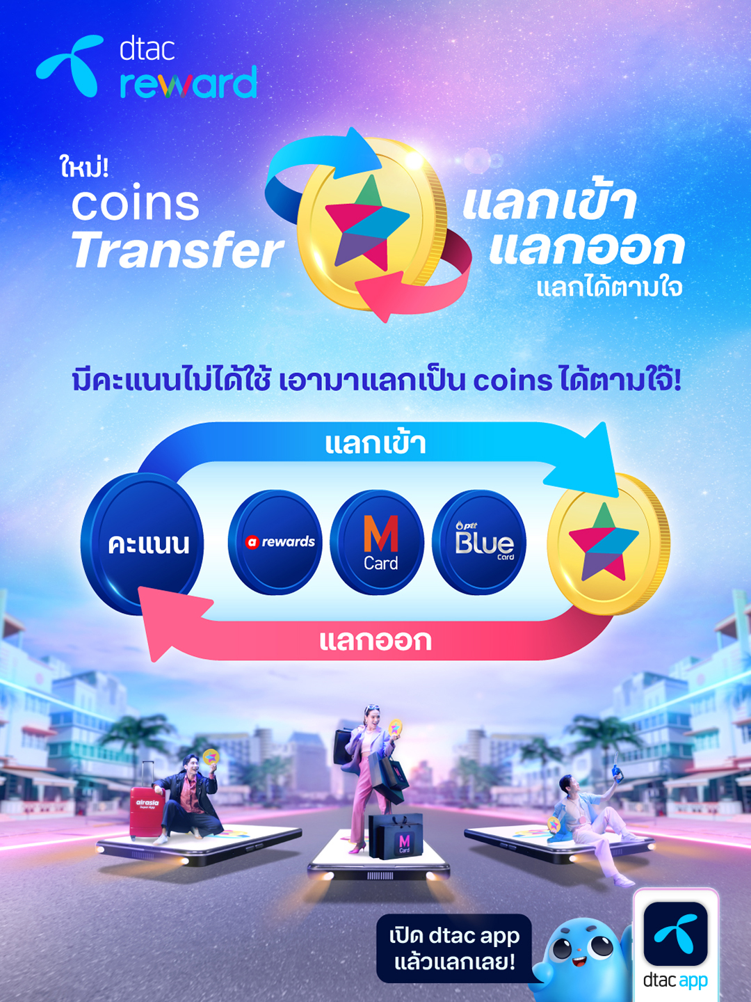 dtac, airasia rewards, M Card and PTT Blue Card customers can see more coins Transfer details on the dtac app or at https://www.dtac.co.th/s/coinsprinfo.