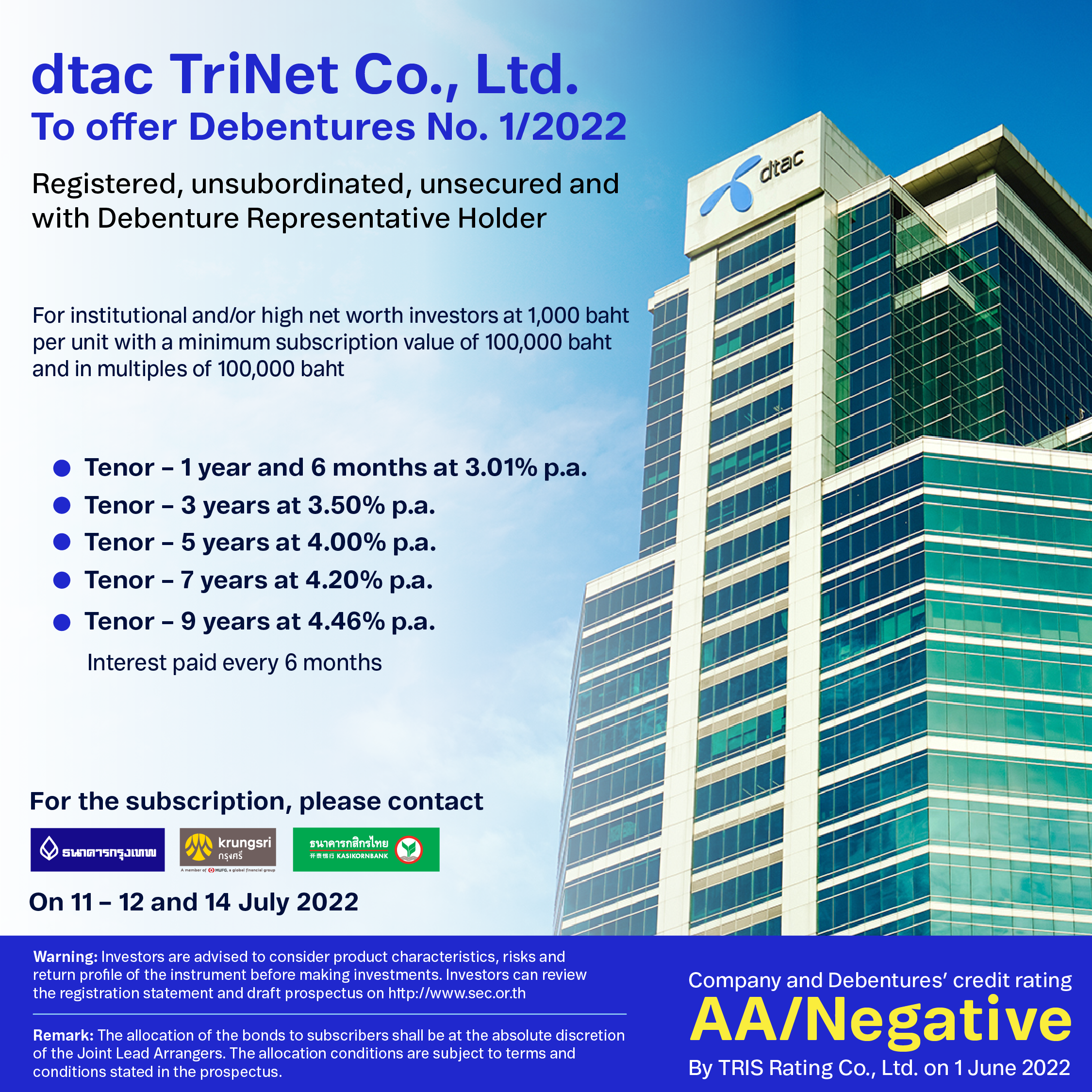 July 5, 2022 – dtac TriNet Company Limited or DTN, a wholly owned subsidiary of Total Access Communications Public Company Limited (dtac), a telecommunications service provider, set interest rates for new bonds at 3.01 – 4.46% per annum. The bonds will be offered during 11 – 12 and 14 July 2022 to institutional investors and/or high net worth investors. The company has been rated “AA” with a “negative” outlook by TRIS Rating Co., Ltd. The bond underwriters are Bangkok Bank, Bank of Ayudhya and Kasikornbank.