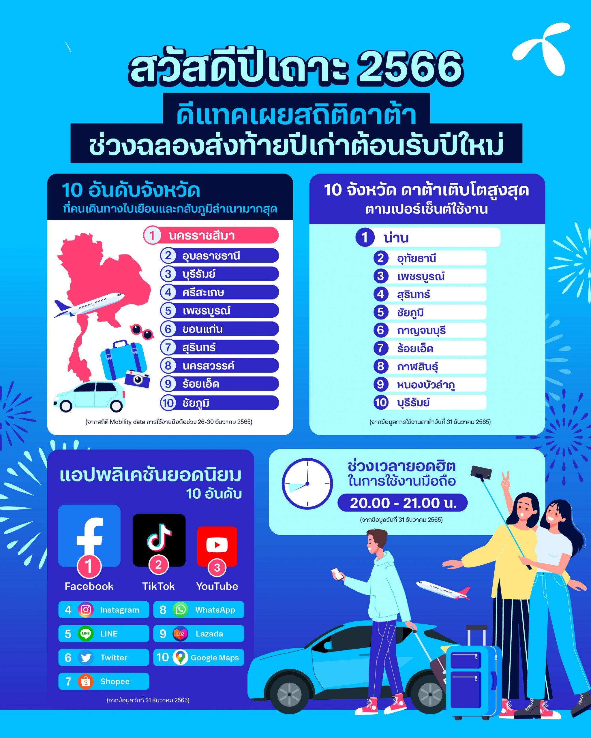 January 1, 2023 – dtac unveils top 10 most popular destinations, 10 provinces with the highest data usage, and 10 most frequently used apps on New Year’s Eve 2022. The records show that peak data usage occurred between 20:00 – 21:00 hrs. on December 31.