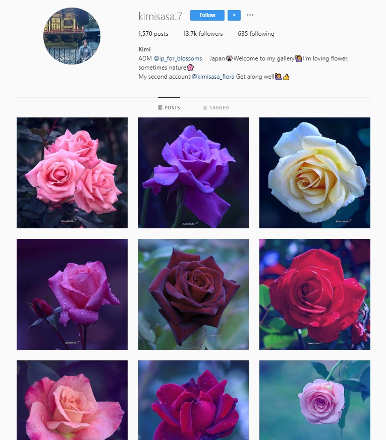 @kimisasa.7 is the Japanese Instagrammer. She started her account at the same period of mine. Her first few pictures were not that beautiful. But lately she knew what she needed to focus on, and that is photos of flowers. Right now, she takes only rose pictures. Just only three years from zero followers, she now has more than 13,000 followers.