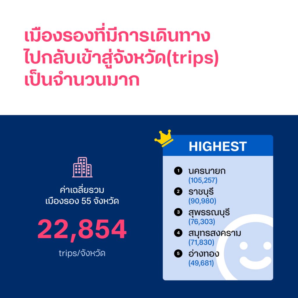 According to a study using mobility data on movement patterns and tourist concentrations during the Covid-19 pandemic, Thais managed to take day trips averaging approximately 150 kilometers. On one hand, tourists from neighboring provinces of Lamphun, Chiang Rai and Nakhon Si Thammarat made 40-60% of their total day trips to these provinces. On the other hand, only 14% of total day trips were made by tourists from neighboring province to other secondary provinces. Some provinces were able to attract tourists even though they required travelling as far as 200 kilometers, such as Mae Hong Son, Ranong, Nan, Phetchabun and Nakhon Phanom. In addition, other provinces were able to attract 3-5 times more day trippers than average, such as Nakhon Nayok, Ratchaburi, Suphanburi, Samut Songkhram and Ang Thong.