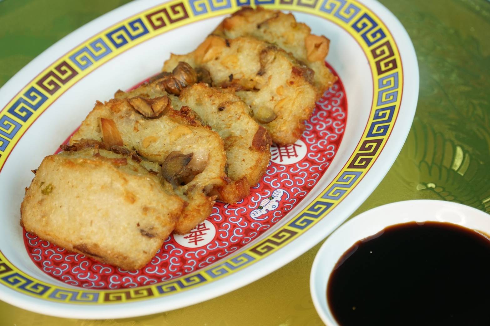 Fried turnip cake also brings us back the fond memory of my childhood seeping a pot of bottomless tea in the dim sum house every Sunday morning. The turnip cake is crispy outside and yet tender, almost melting in the mouth inside. Before that, dipping with black sweet soya sauce is savory.