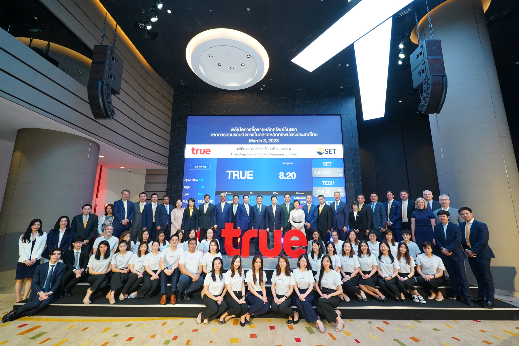 3 March 2023 – True Corporation Public Company Limited – SET: TRUE – today begins its first trading day after the completion of the amalgamation on the Stock Exchange of Thailand (SET). The Company is listed in the Information & Communications Technology sector and with an opening price of THB 8.35 in the technology industry Information and communication technology business category. The amount of the registered capital and the paid-up capital of 138,208,403,204 baht and the total number of issued equal to 34,552,100,801 shares, par value 4 baht per share.