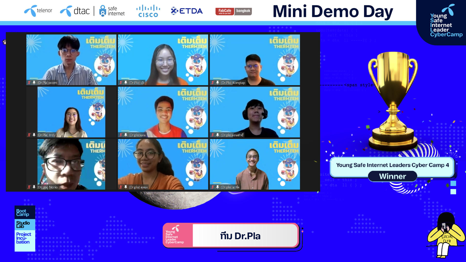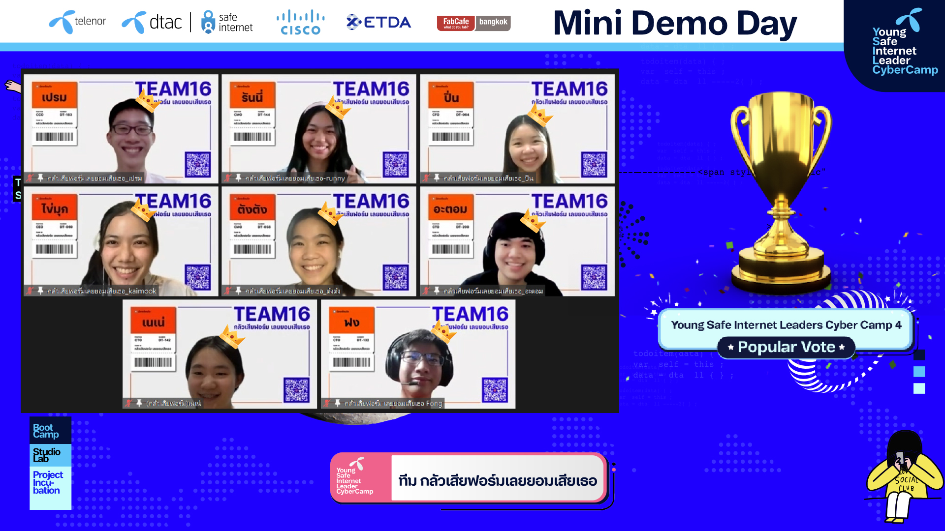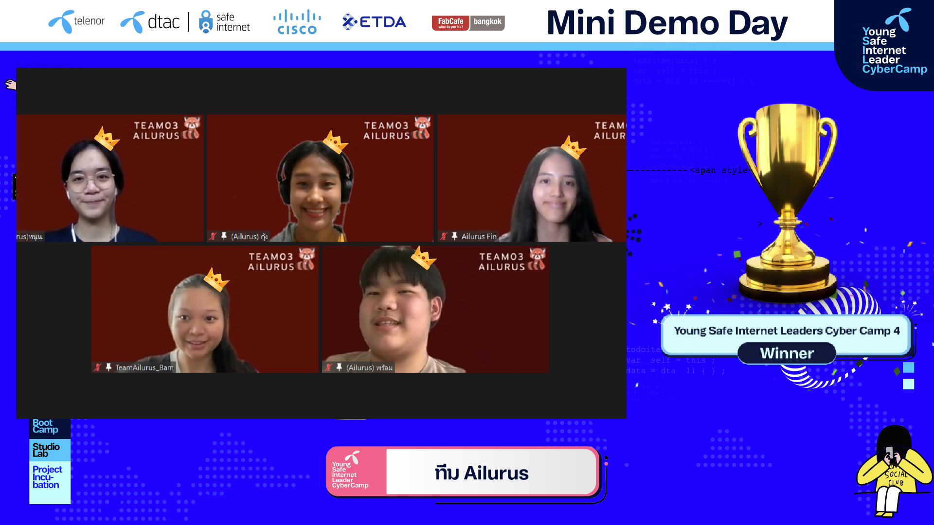 13 May 2022 – From a competitive pool of 1,178 applicants, dtac selected 200 young people to participate in a three-week Young Safe Internet Leader Cyber Camp. Delivered via the Metaverse, the camp invited participants into a Cybersecurity Sandbox where they developed innovations for public good. Five of the best teams were declared winners for their brilliant and practical projects. These winners were: