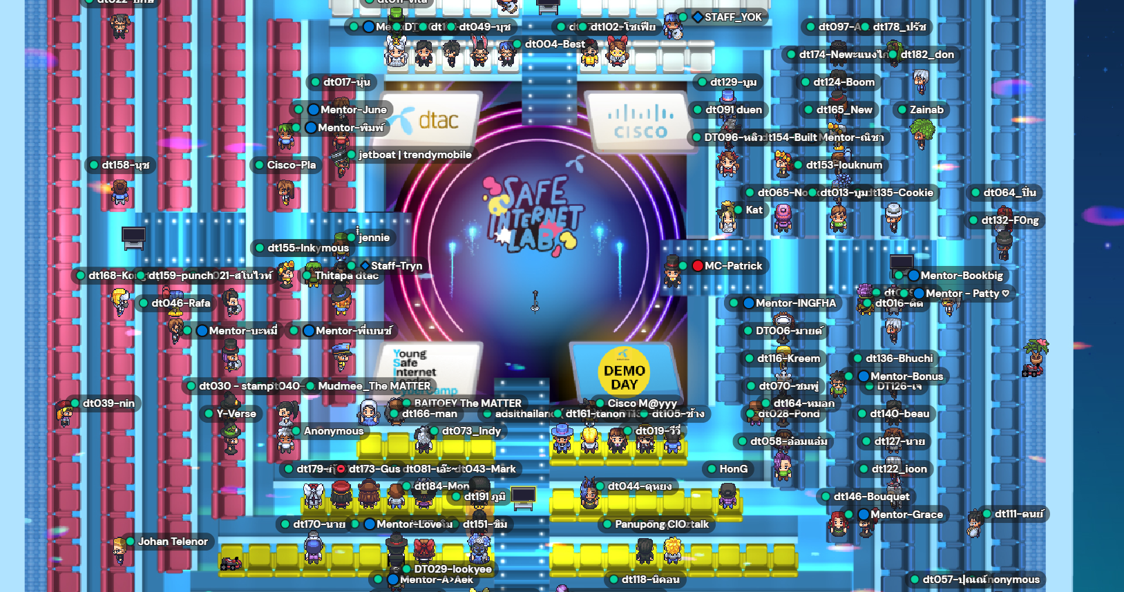 Young Safe Internet Leaders spent more than 504 hours on the Metaverse, in dtac’s so-called Cybersecurity Sandbox. In the sandbox, young participants brainstormed ideas and developed their projects with their peers. Thanks to the help of their coaches, they were also exposed to startup-like work process through which they engaged in team matching, design thinking, Business Model Canvas, and pitching. At the end of the project, they had to present their creations to judges on Demo Day.