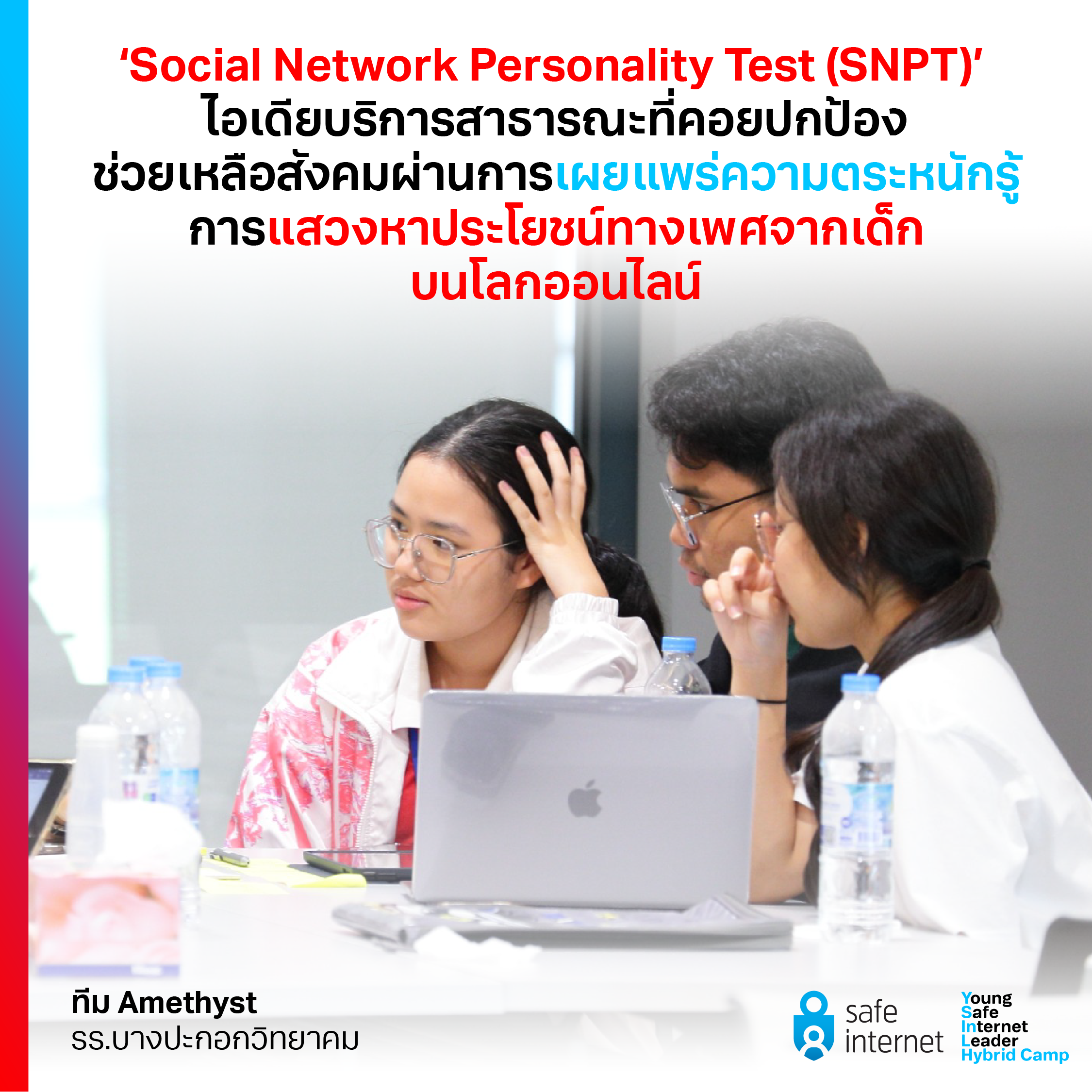 The first runner-up of the competition is Amethyst Team, composed of five students from Bangpakok Witthayakom School, Donrawee Angsuchawalit, Tanakrit Boonyaworkul, Pawarisa Thongchua, Kritin Amluek, and Pattarakorn Satanikom. The team’s solution is based on the belief that sexual violations occur due to “ignorance” on the part of both victims and abusers. They propose that raising public awareness about the issue can help reduce the number of victims and wrongdoers. To achieve this, Amethyst Team has designed a public service called the Social Network Personality Test (SNPT). This innovative initiative aims to enhance people’s awareness of sexual harassment through the utilization of a personality test conducted on social media platforms.